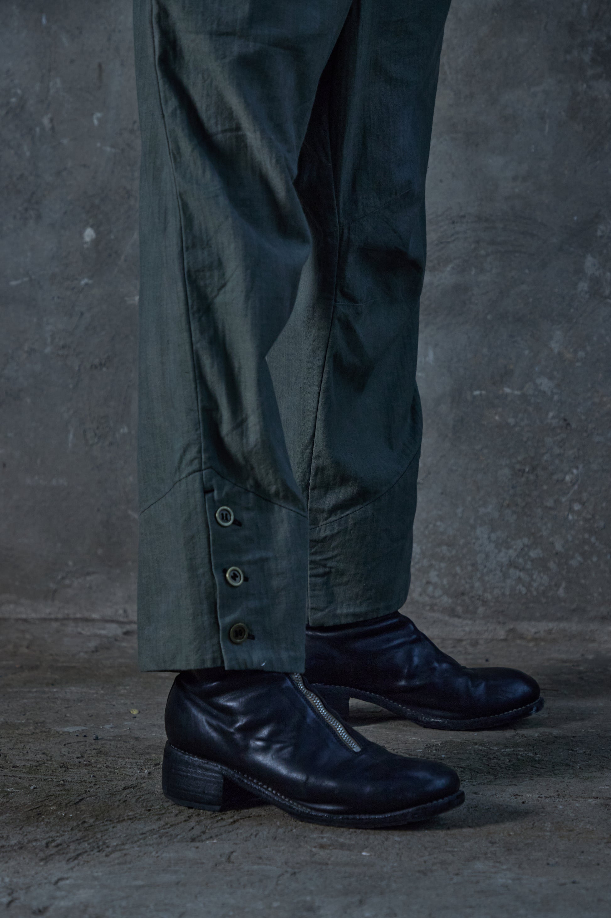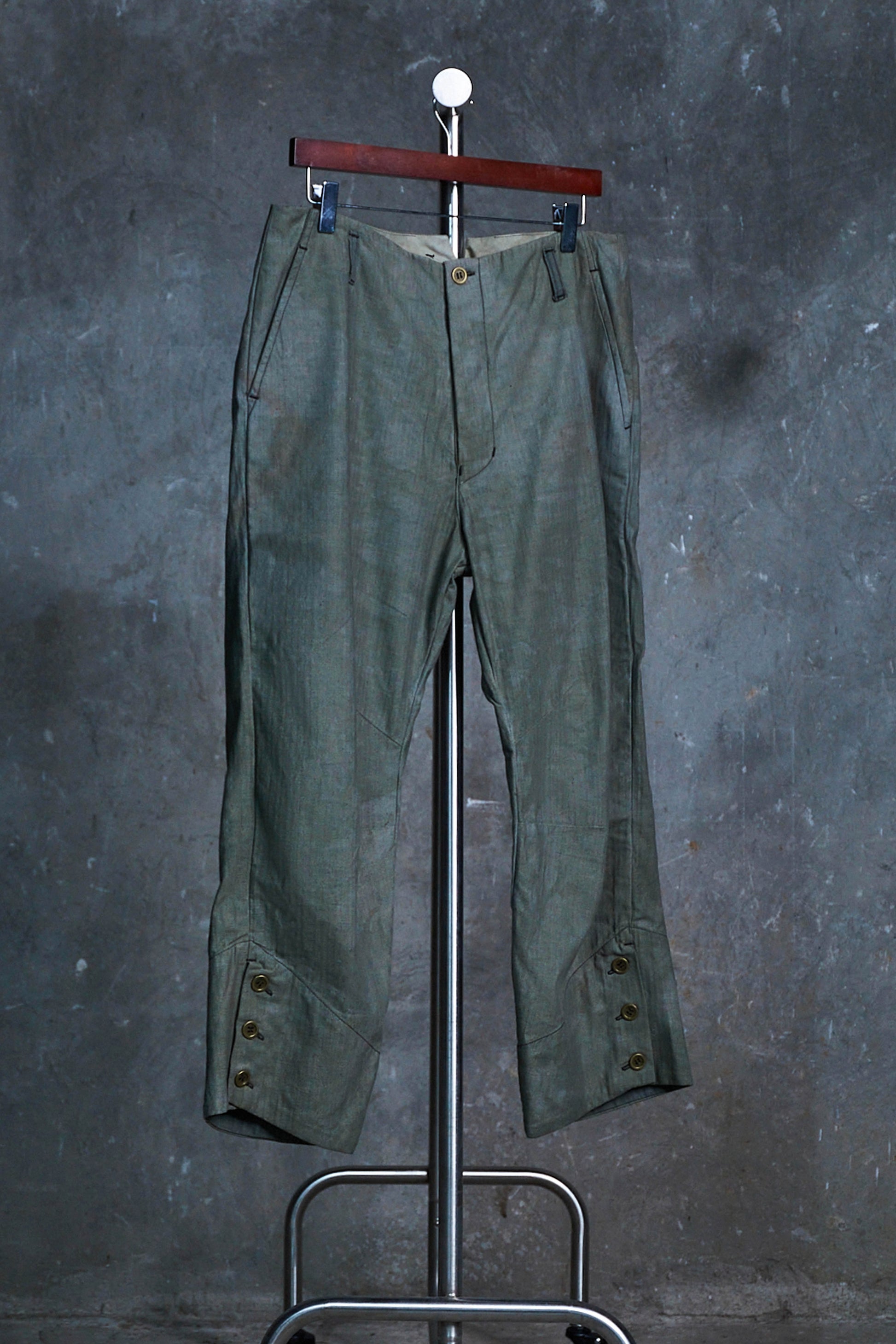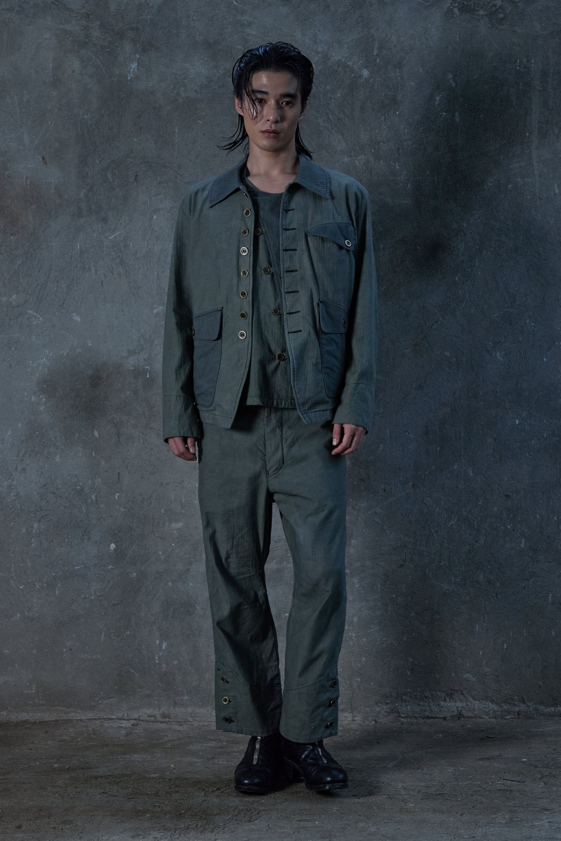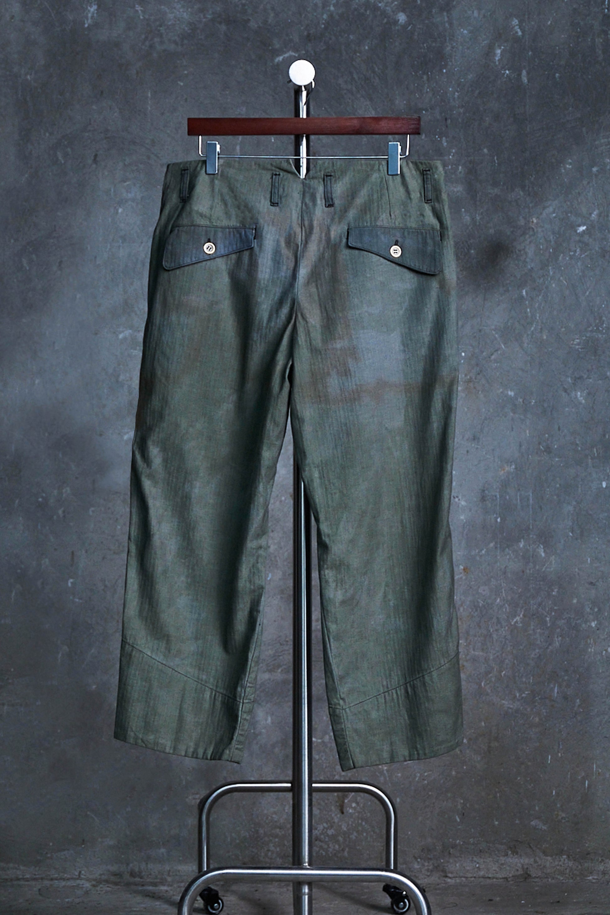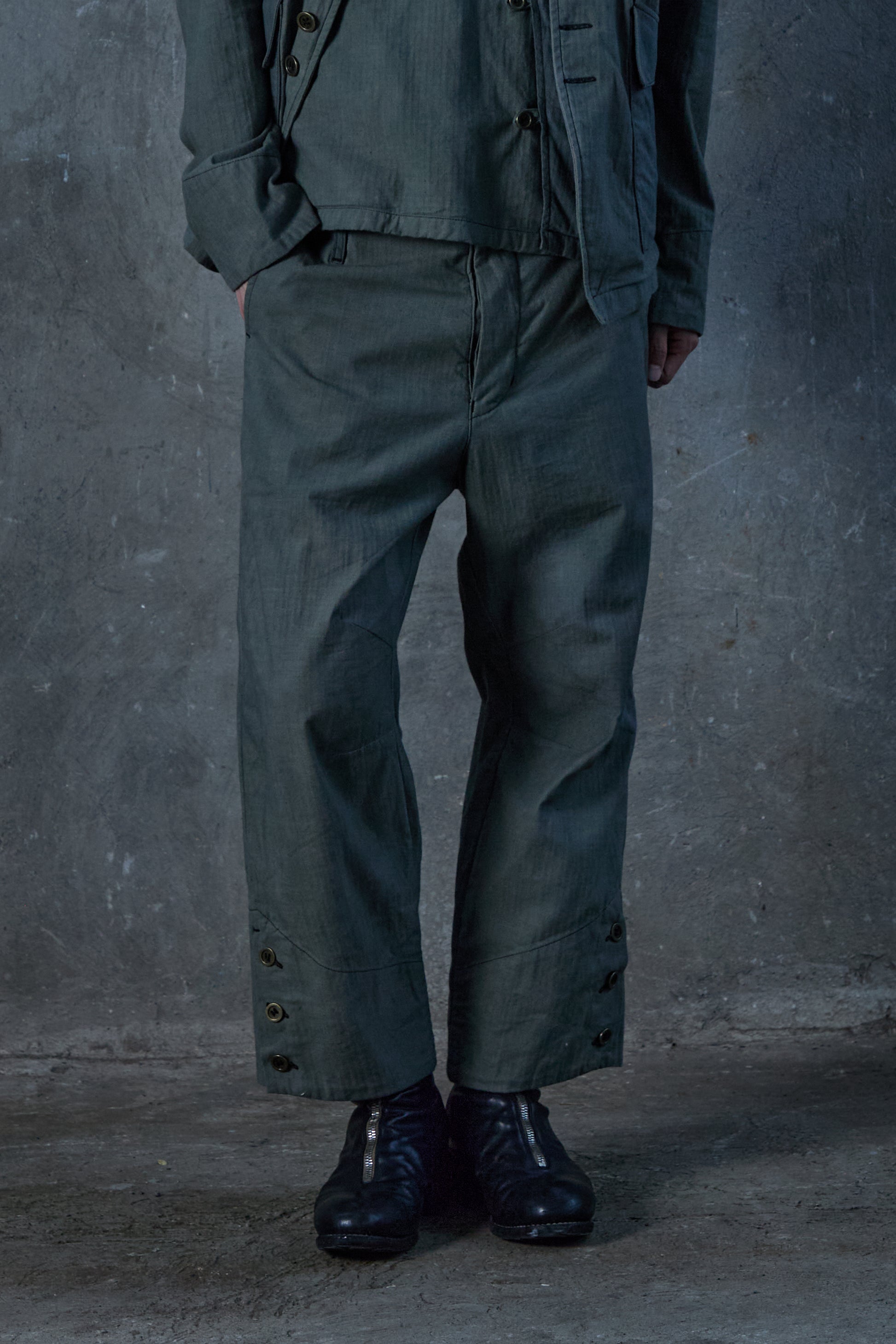 Cropped-fit pants with a slightly flared hem, crafted from an overdyed pure herringbone cotton fabric. The buttoned-hem construction highlights the metal buttons predominantly used for this collection, while simultaneously echoing the sleeve detail of its matching piece - the Overdyed Work Jacket. Darts are placed around the knee for shaping, while the waistband slit allows for a comfortable fit. Finished with back flap pockets and a full bias-bound seam interior. Pair with the Overdyed Work Jacket for the full set.
