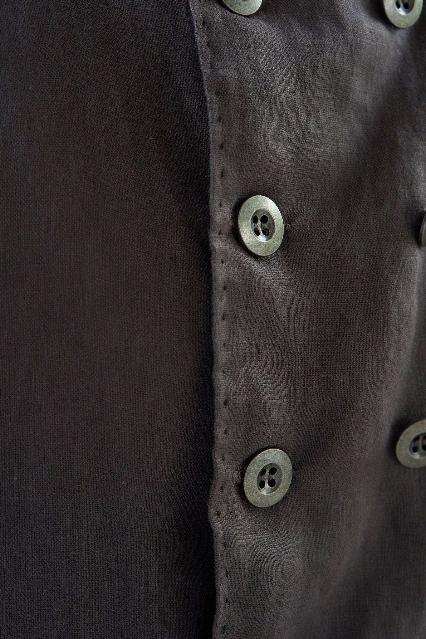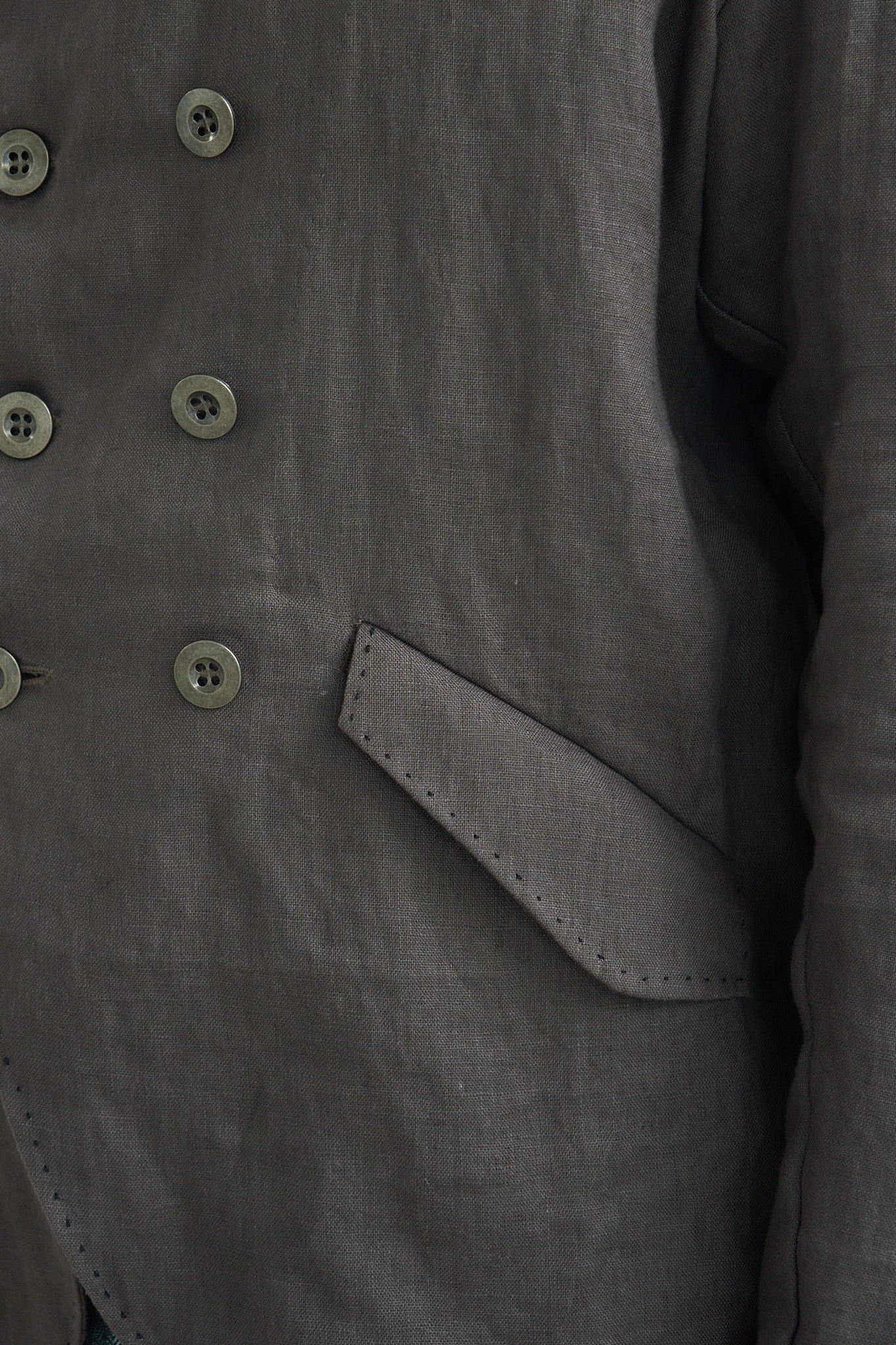 Softly tailored double breasted jacket with an unlined, fully bias bound construction. Cut from a 100% linen fabric, this jacket offers a lighter weight option of one of our signature pieces. Finished with brass buttons and hand-sewn pick stitching on body, pocket flaps, and hems.