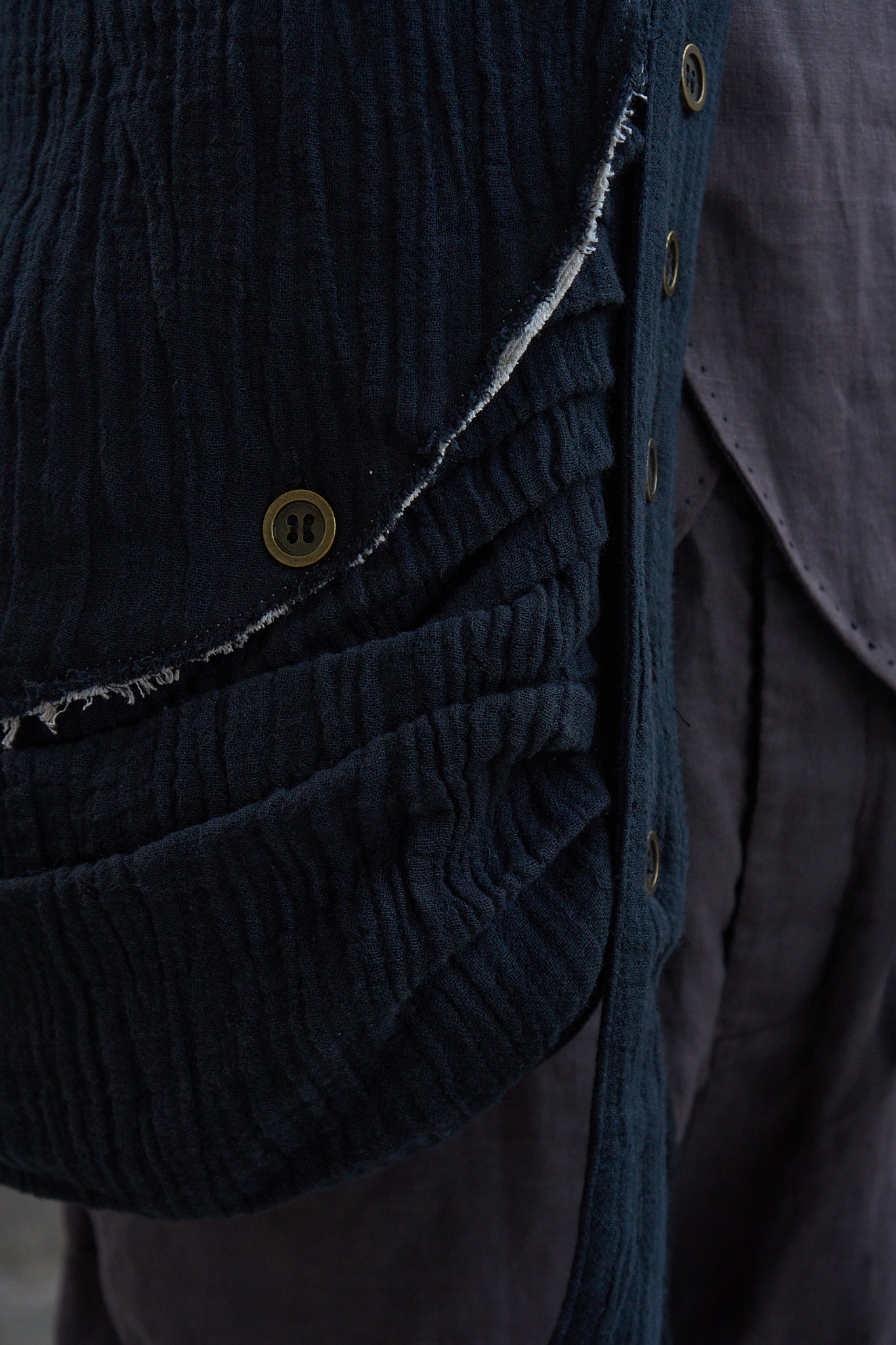 Messenger style crossbody bag with an asymmetrical raw-edge flap, cut from a ramie/cotton blend crepe fabric. Multiple pleating on the body gives volume and visual interest to the piece. Multiple brass buttons on the strap (and flap) allows adjustment of length. Fully lined with a 100% linen herringbone fabric. Finished with an interior pocket with multiple compartments.