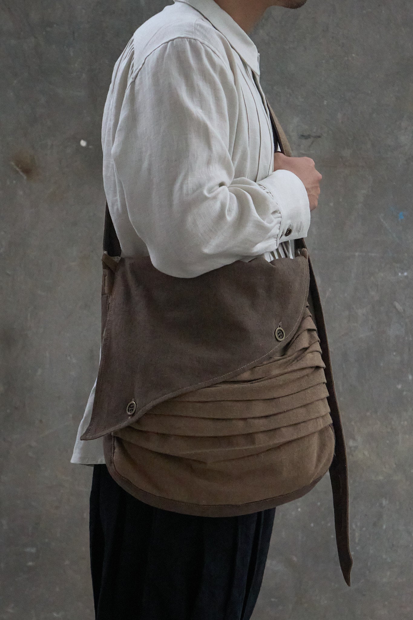 Messenger style crossbody bag with an asymmetrical flap, cut from a cotton/linen blend twill fabric. Multiple pleating on the body gives volume and visual interest to the piece, and is complimented by the two-toned effect of the reversed panels. Multiple brass buttons on the strap (and flap) allows adjustment of length. Fully lined with a 100% linen herringbone fabric. Finished with an interior pocket with multiple compartments.