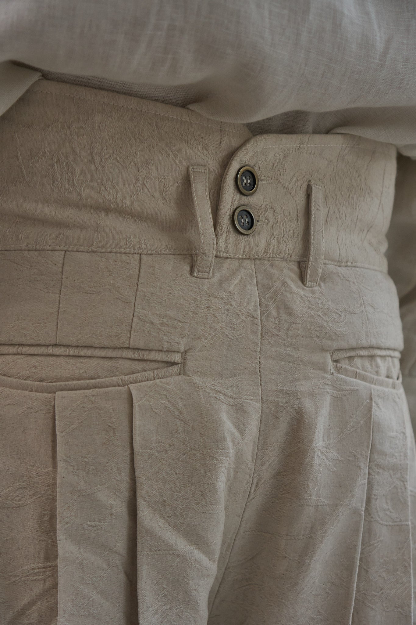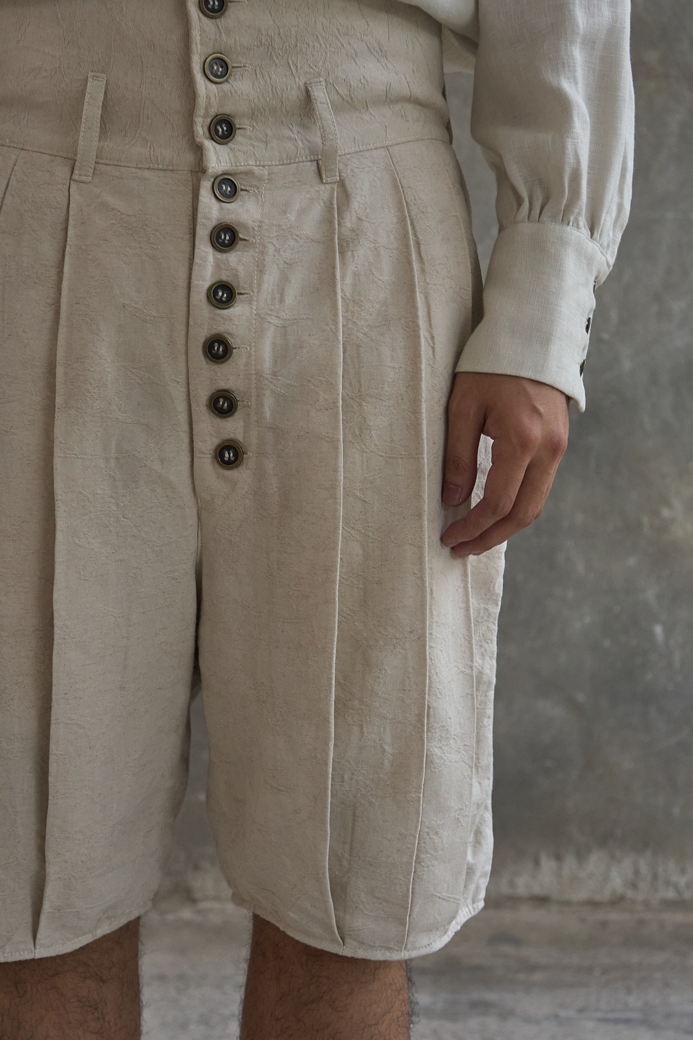 High-waisted shorts with an exposed button-fly, cut from a cotton/linen/rayon blend jacquard fabric. Multiple precise pleating on the front and back of the body gives volume and movement to the piece, while a corset-style waistband with adjustable back buttons is used to give balance. Finished with welted pockets and brass buttons.