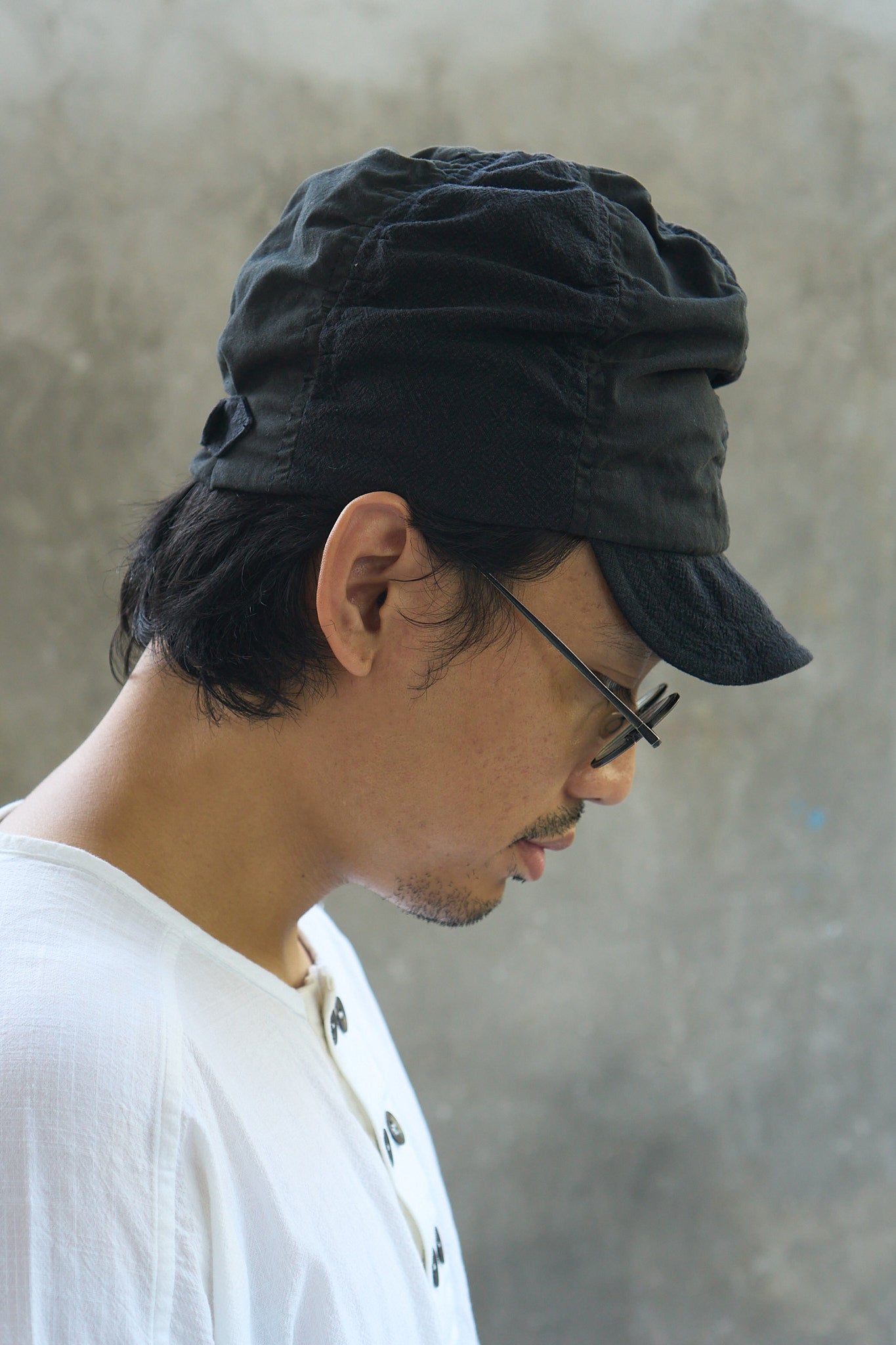 6-panel hat constructed in two different, but tonal, cotton/linen blend fabrics. Each panel of the hat is shirred to create intentional puckering on the seams - allowing for a permanently wrinkled look to the piece. Back tabs are added for adjustment of fit, while the brim is constructed to have a softer feel. Fully lined with a 100% linen herringbone striped fabric.