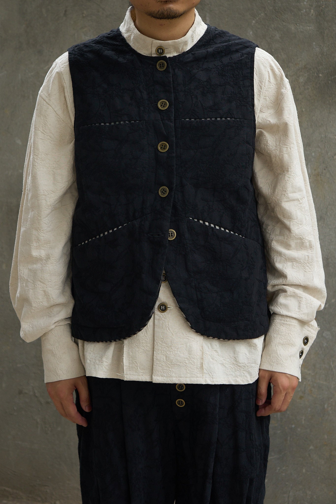 Slightly cropped reversible vest with different pocketing styles on either side. Side A is cut from a 100% linen herringbone striped fabric, with both sides of the material utilized on the different panels to create an alternating two-toned look. Side B, on the other hand, is cut from a cotton/linen/rayon blend jacquard fabric all throughout for a more subtle textured look. Finished with curved hems and side slits.