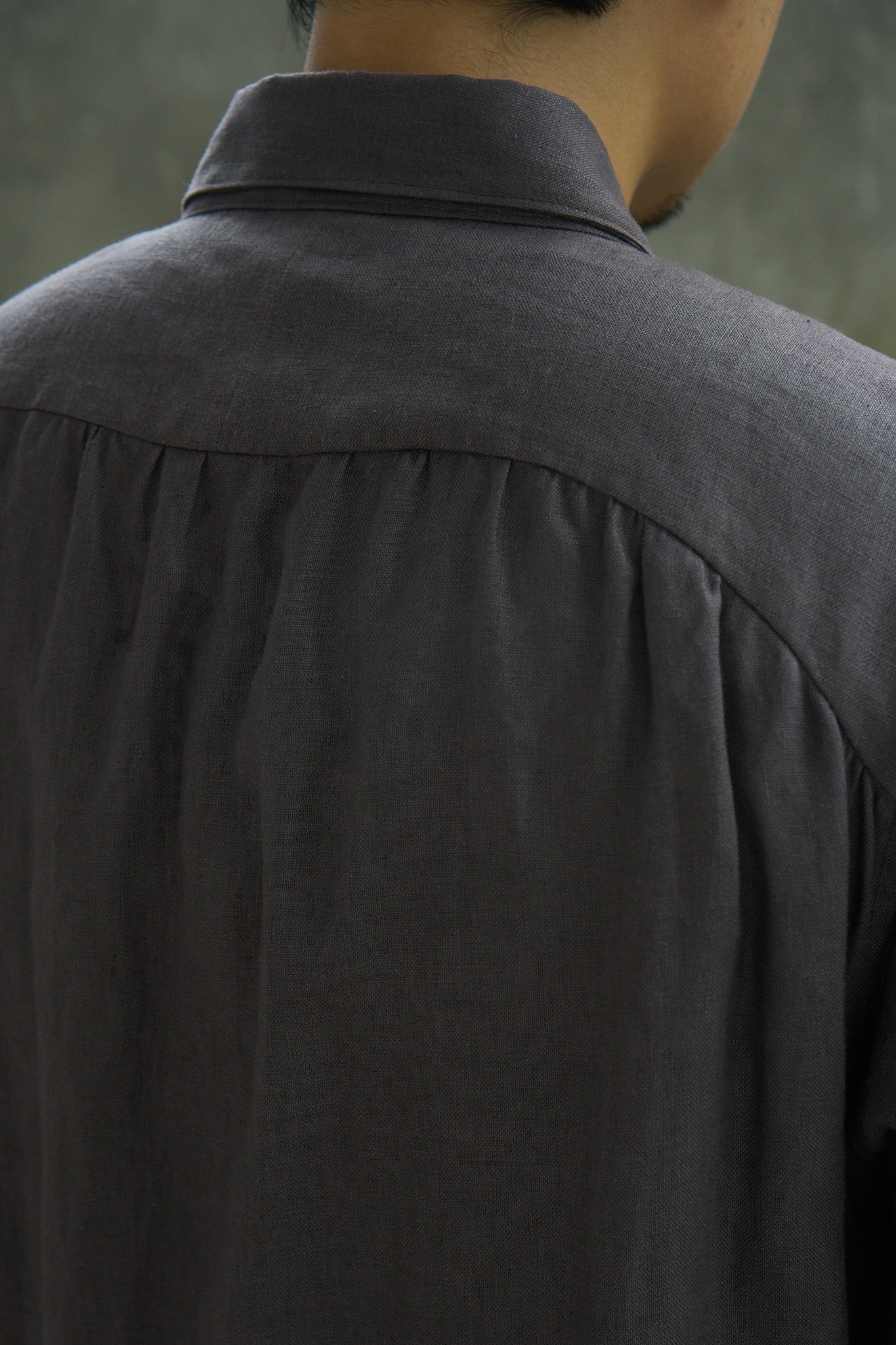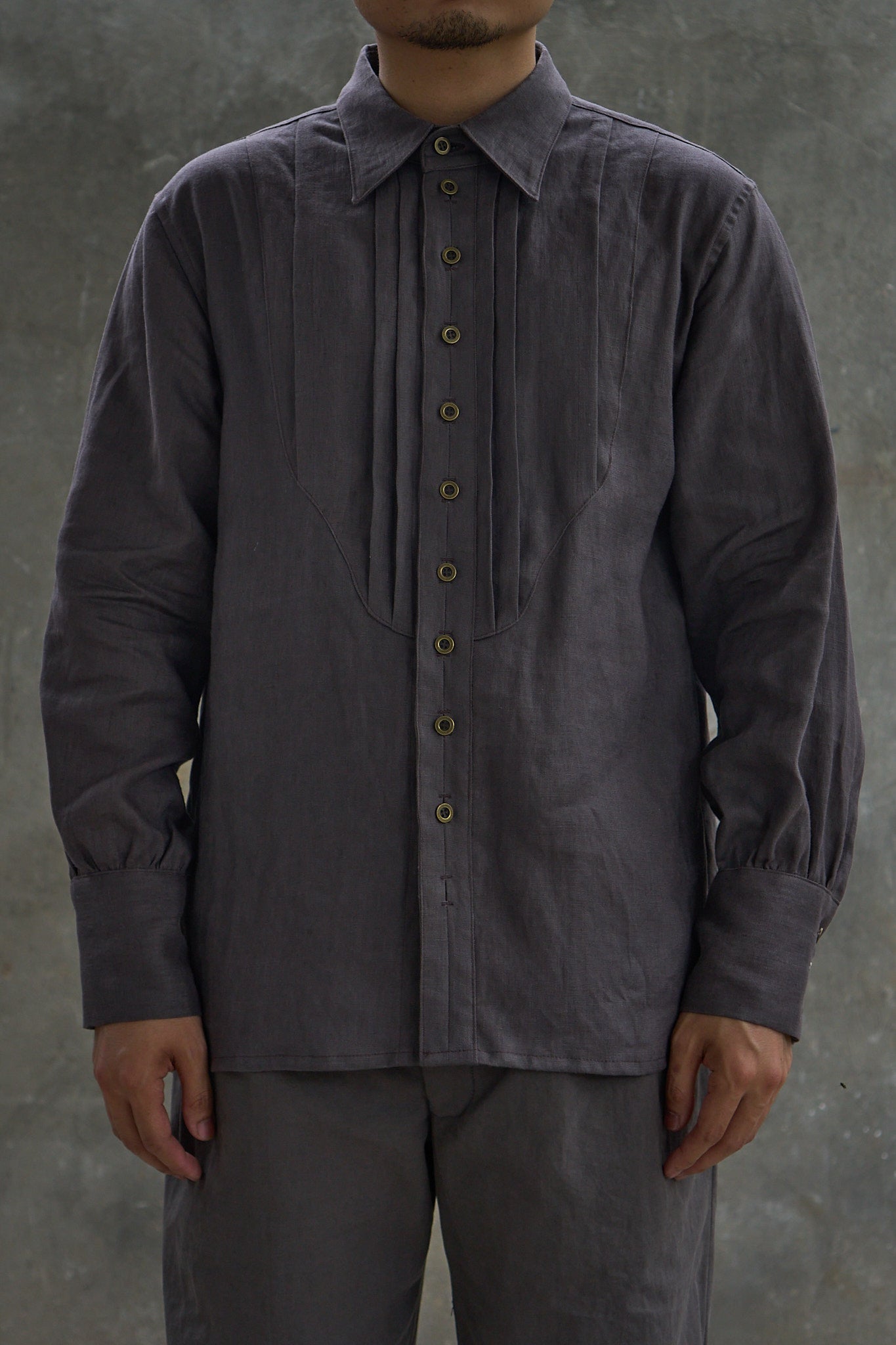 Standard fit long sleeve shirt with a pleated bib detailing on chest, crafted from a 100% linen fabric. The placket features slit openings as button closure instead of traditional buttonholes, and is reinforced throughout using bartacks. Shirring along the back yolk and sleeves add volume to the shirt. Finished with a pointed collar, slightly curved hems, and brass buttons.