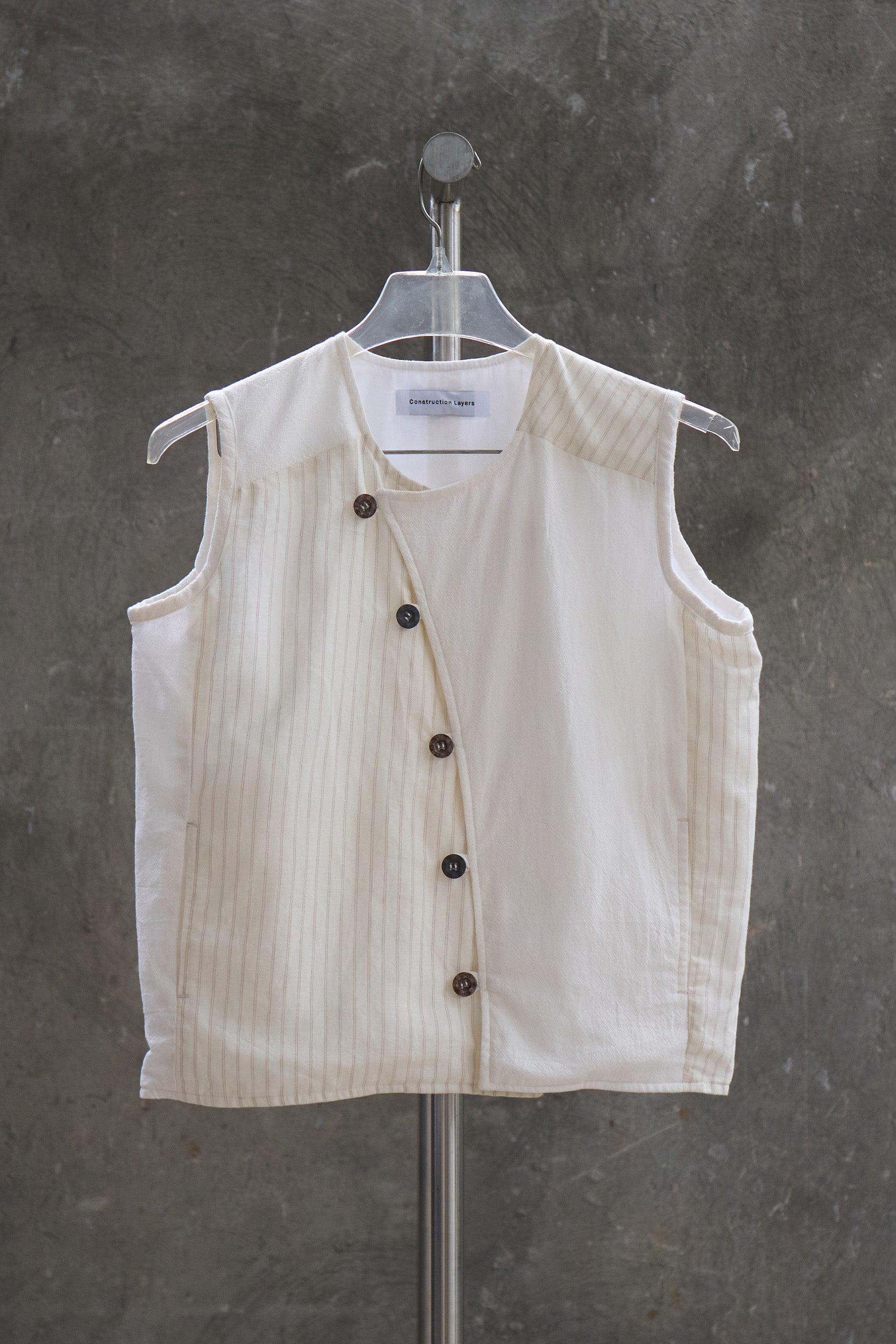 Cropped-fit vest featuring an overlapping placket fastened via buttoned loops. The body is cut from both textured cotton and striped linen fabrics, providing a two-tone effect to the vest. Fully lined with a light cotton twill fabric. Finished with mismatched brass buttons sourced from japan.