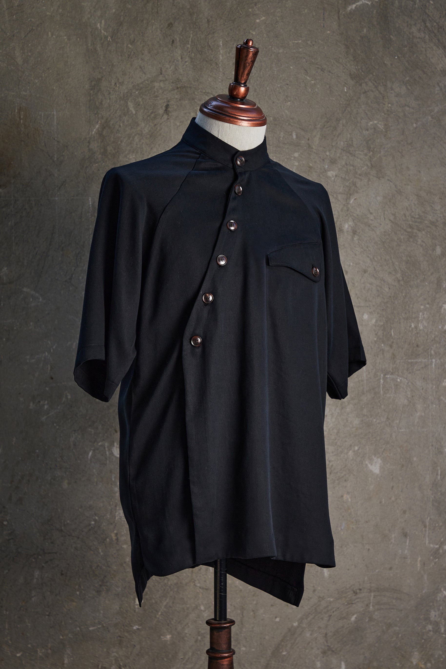 Tencel-twill short sleeve shirt with a cheongsam-inspired placket design. Cut with a loose silhouette, this article is crafted from a soft and drapey TENCEL™ twill fabric. Raglan sleeves that extend to the yolk provide ease of movement during wear, while the front body utilizes a single chest flap pocket. Finished with a longer back hem, a mandarin collar, and an inverted box pleat at the back. French seams all throughout the interior.