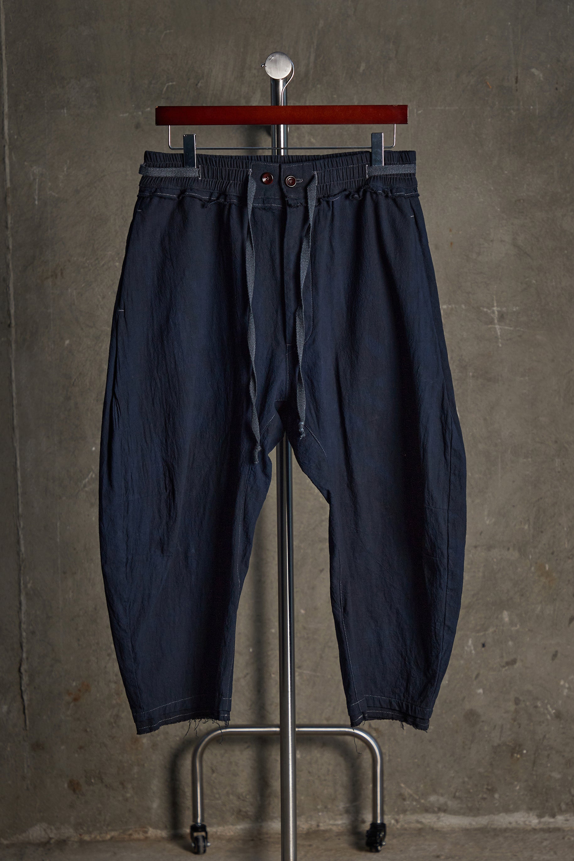 Drawstring cotton/linen blend trousers with darted curved outseams. Crafted from a textured crosshatch cotton/linen blend fabric, these trousers are cut to have a rounded and cropped silhouette. The slight drop-crotch utilizes a gusset for reinforcement and comfort. Seam pockets on the sides and back. Finished with herringbone pure-cotton drawstrings and a double-hem construction that reflects the raw-edge insert found on the waistband. This article has then been hand-dyed in-house to achieve an uneven color, making each piece unique.