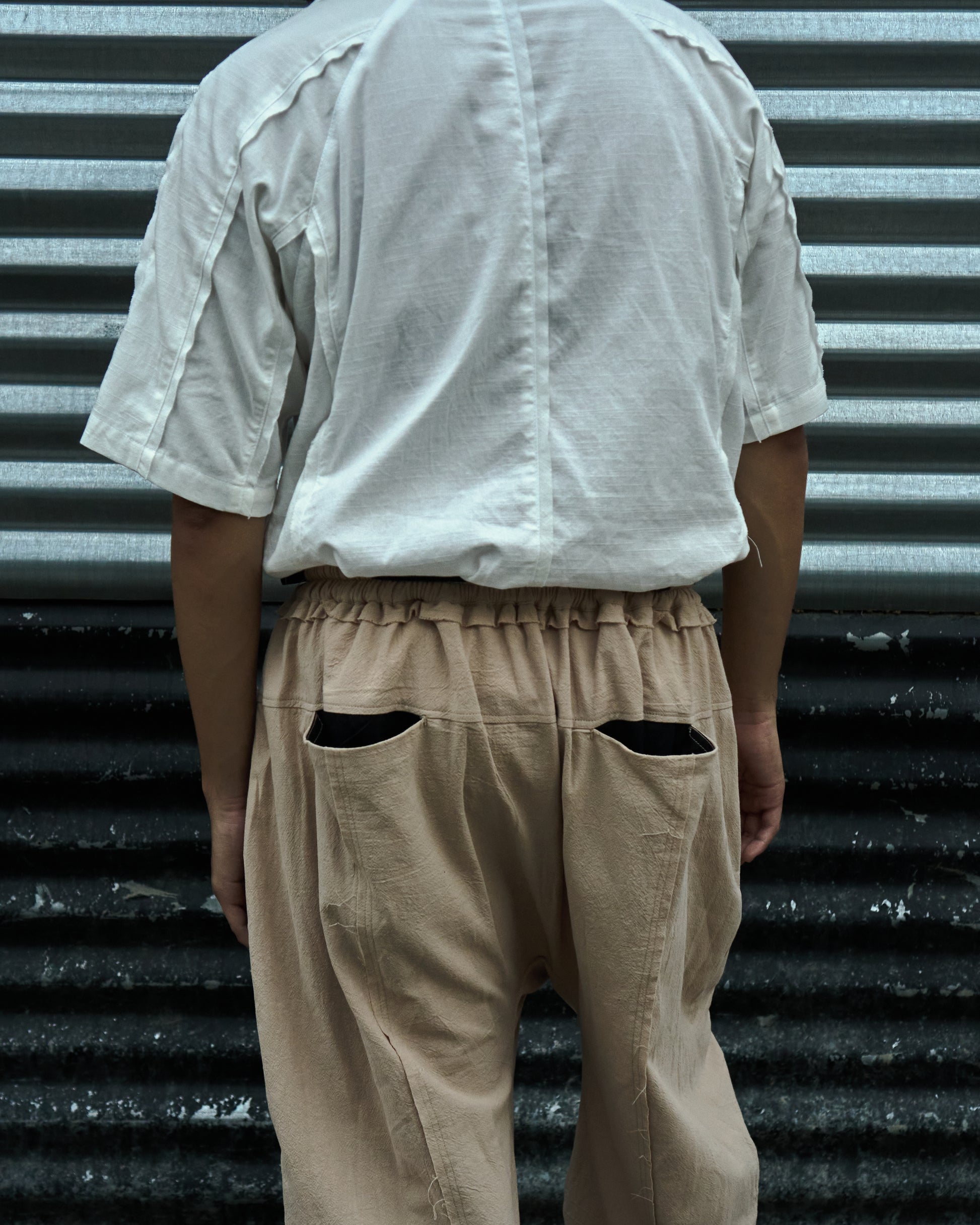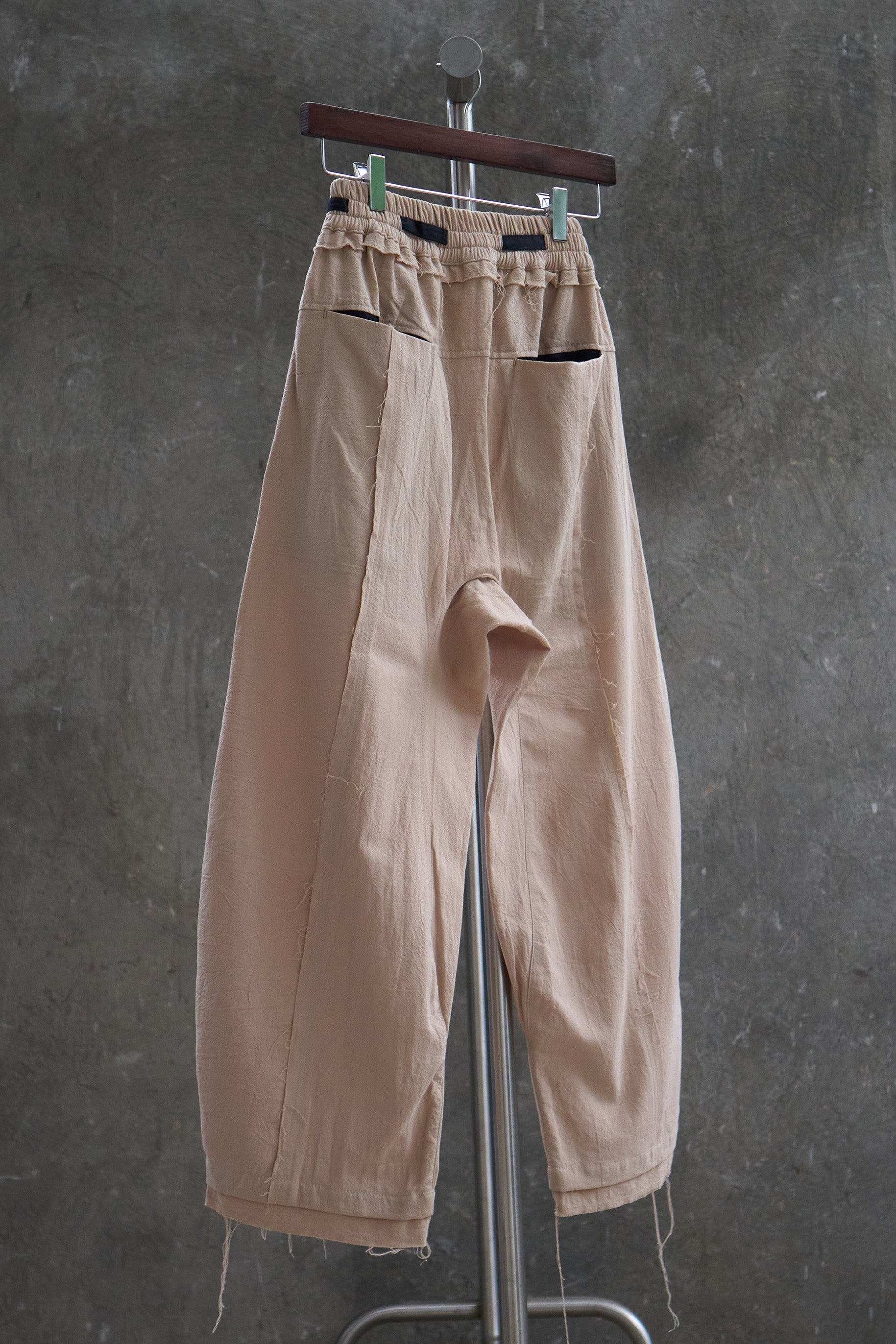 Drawstring trousers with darted curved outseams. Crafted from a textured cotton fabric, these trousers are cut to have a rounded silhouette. The slight drop-crotch uses a gusset for reinforcement and comfort, while the pockets and drawstring provide a two-tone look. Finished with a double-hem construction and brass buttons sourced from Japan.