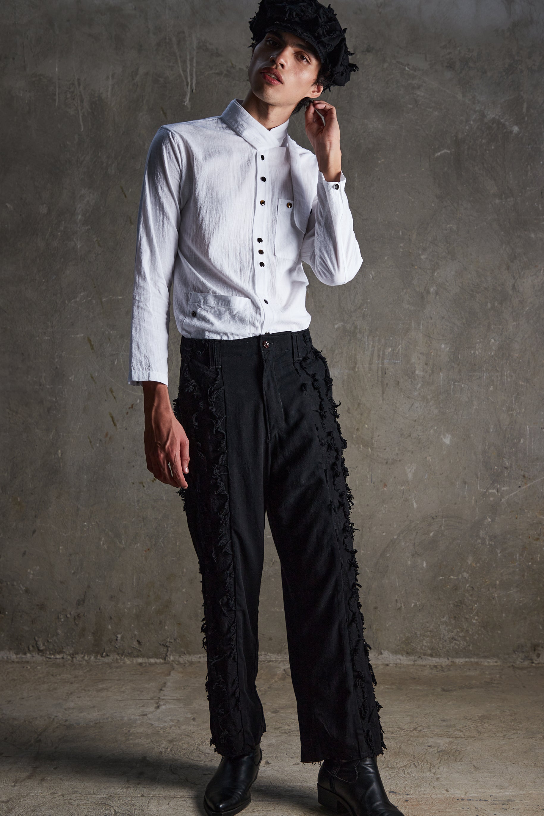 Straight leg zip-fly trousers crafted from Italian cheesecloth and fringe jacquard fabrics. As part of the fringe jacquard set developed for this collection, these trousers are cut in a high-rise and straight fit silhouette. Deep back pockets ensure capacious storage while the raw hems provide room for any needed alterations. Like the Overlap Jacket from the same set, the interior is finished using bias bound seams. Pair with our Overlap Jacket for the full set.