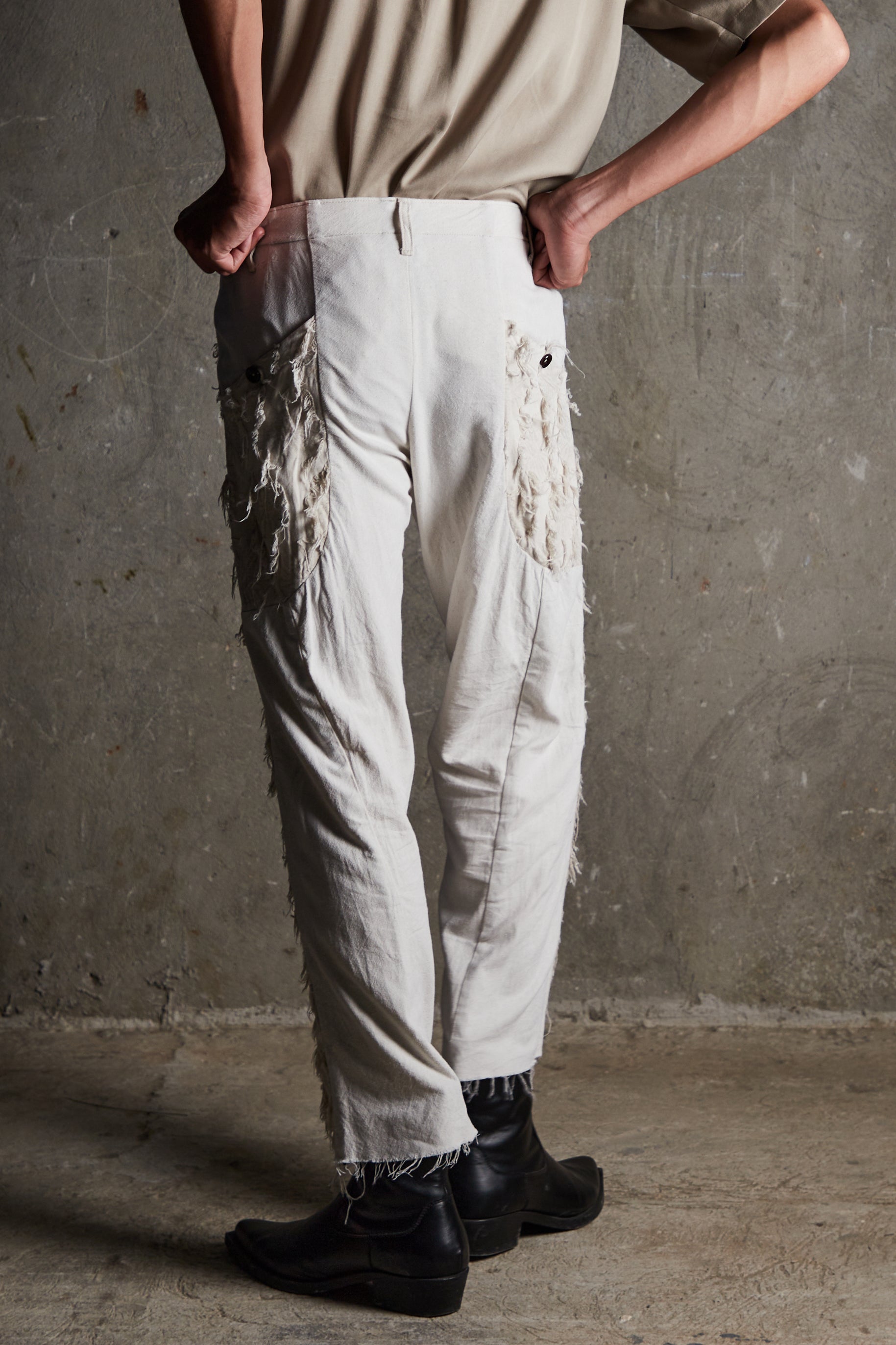 Straight leg zip-fly trousers crafted from italian cheesecloth and fringe jacquard fabrics. As part of the fringe jacquard set developed for this collection, these trousers are cut in a high-rise and straight fit silhouette. Deep back pockets ensure capacious storage while the raw hems provide room for any needed alterations. Like the Overlap Jacket from the same set, the interior is finished using bias bound seams. Pair with our Overlap Jacket for the full set.