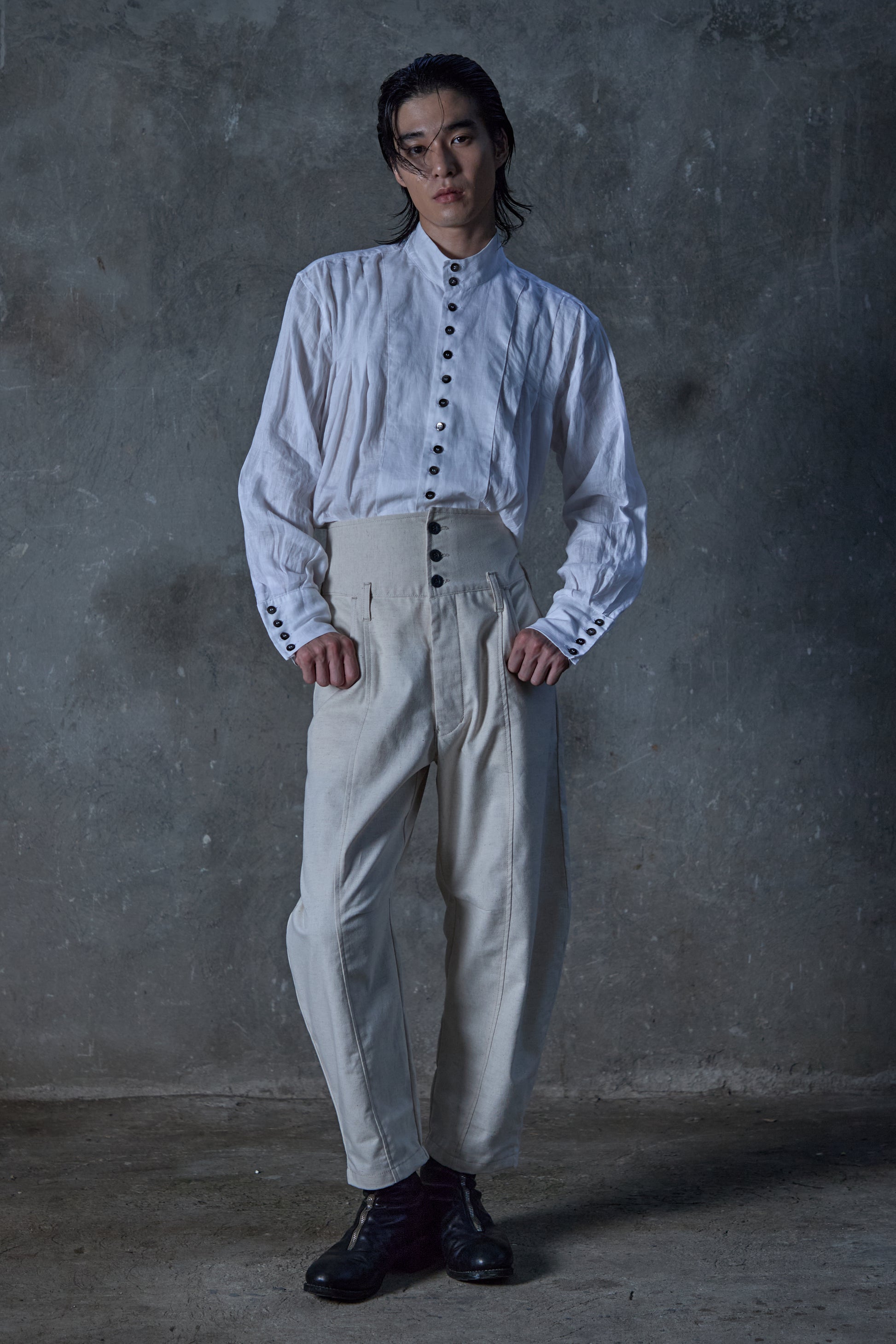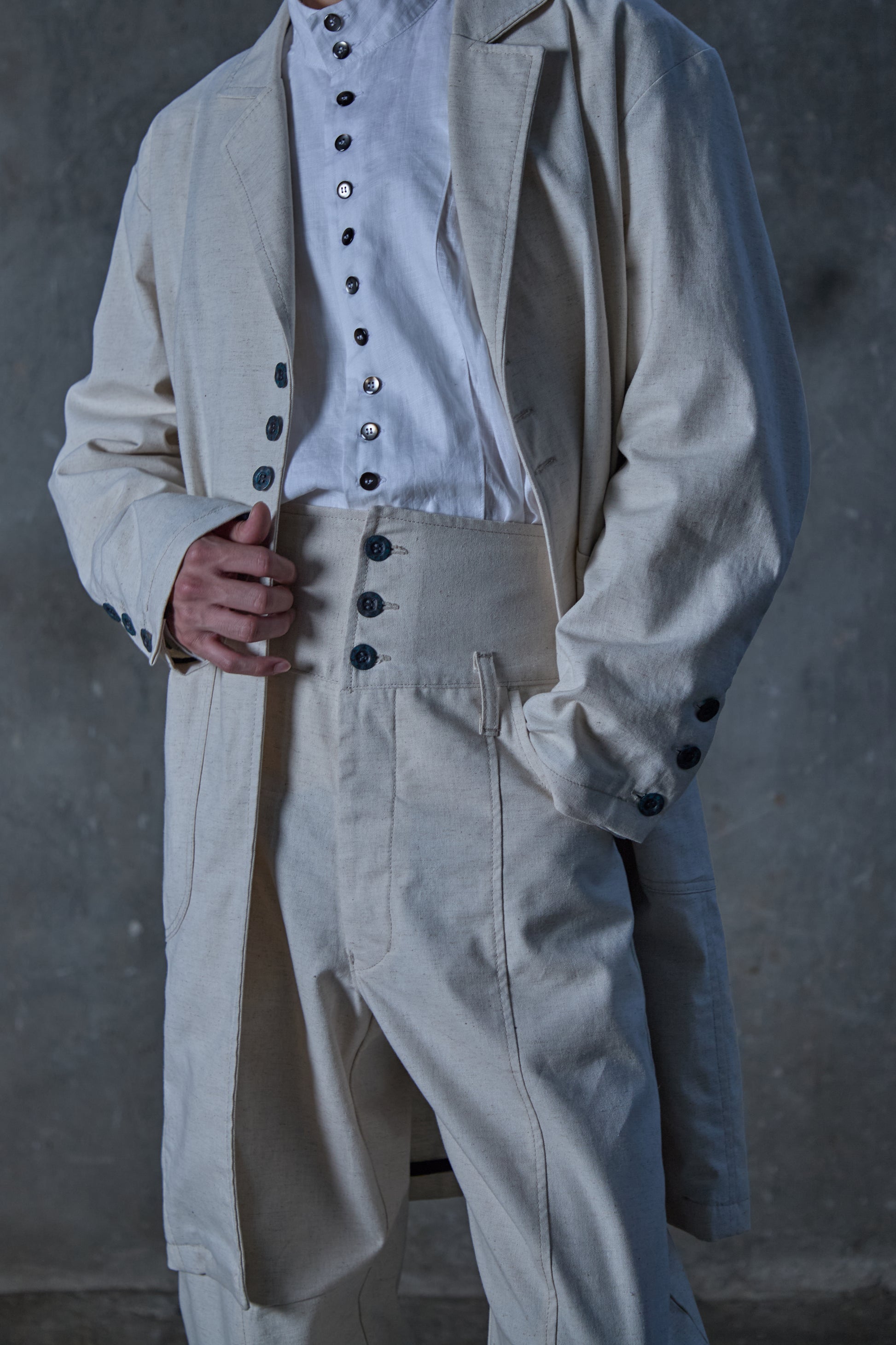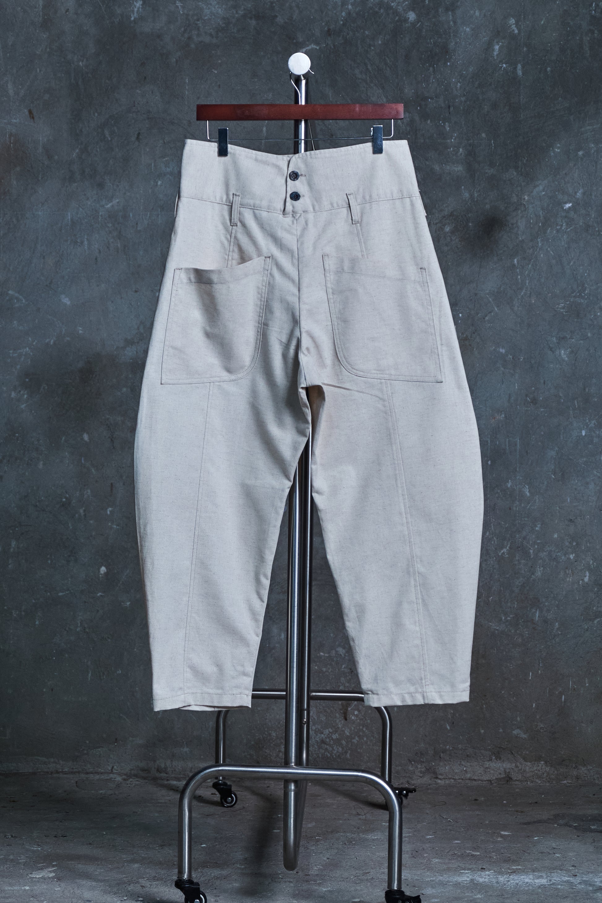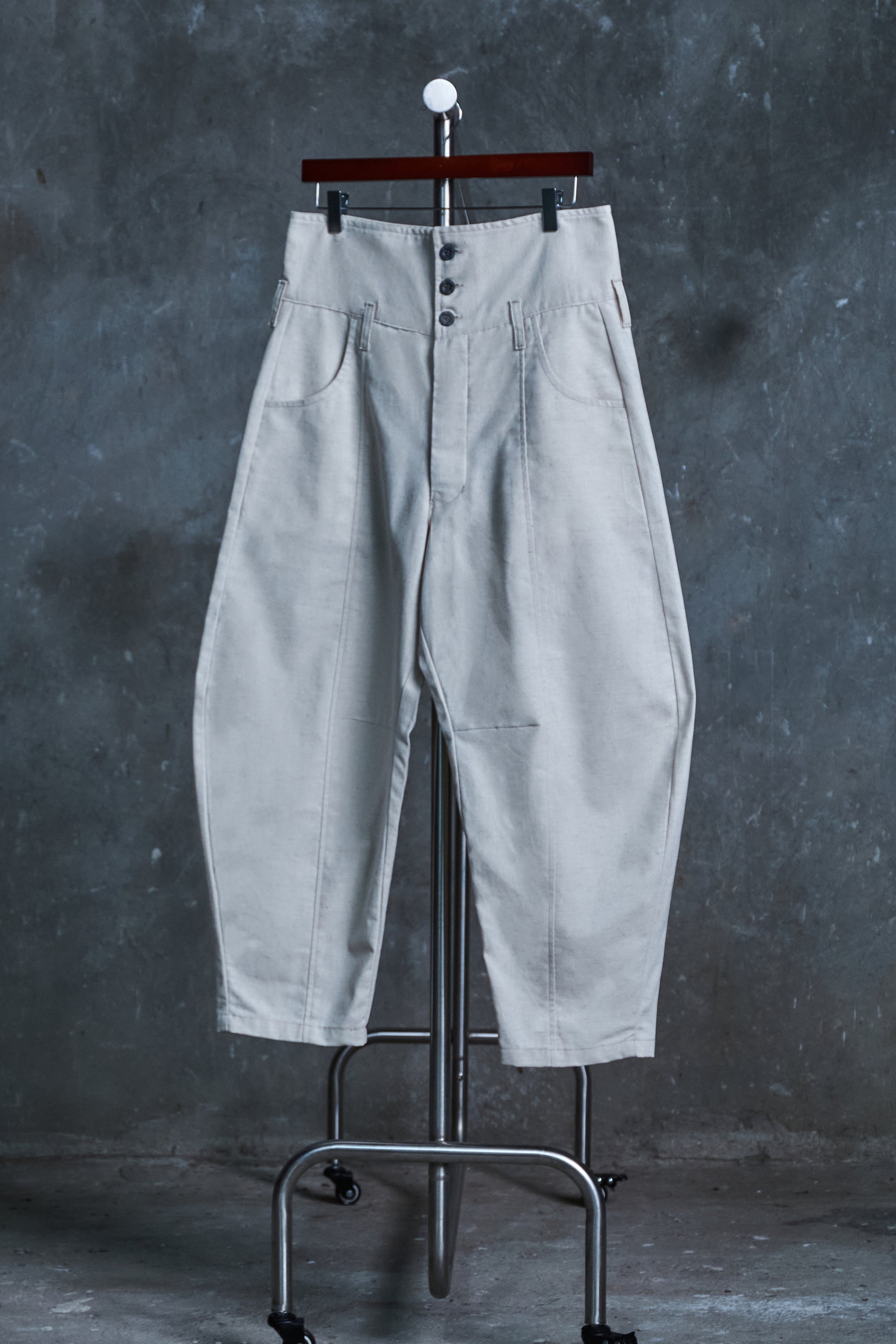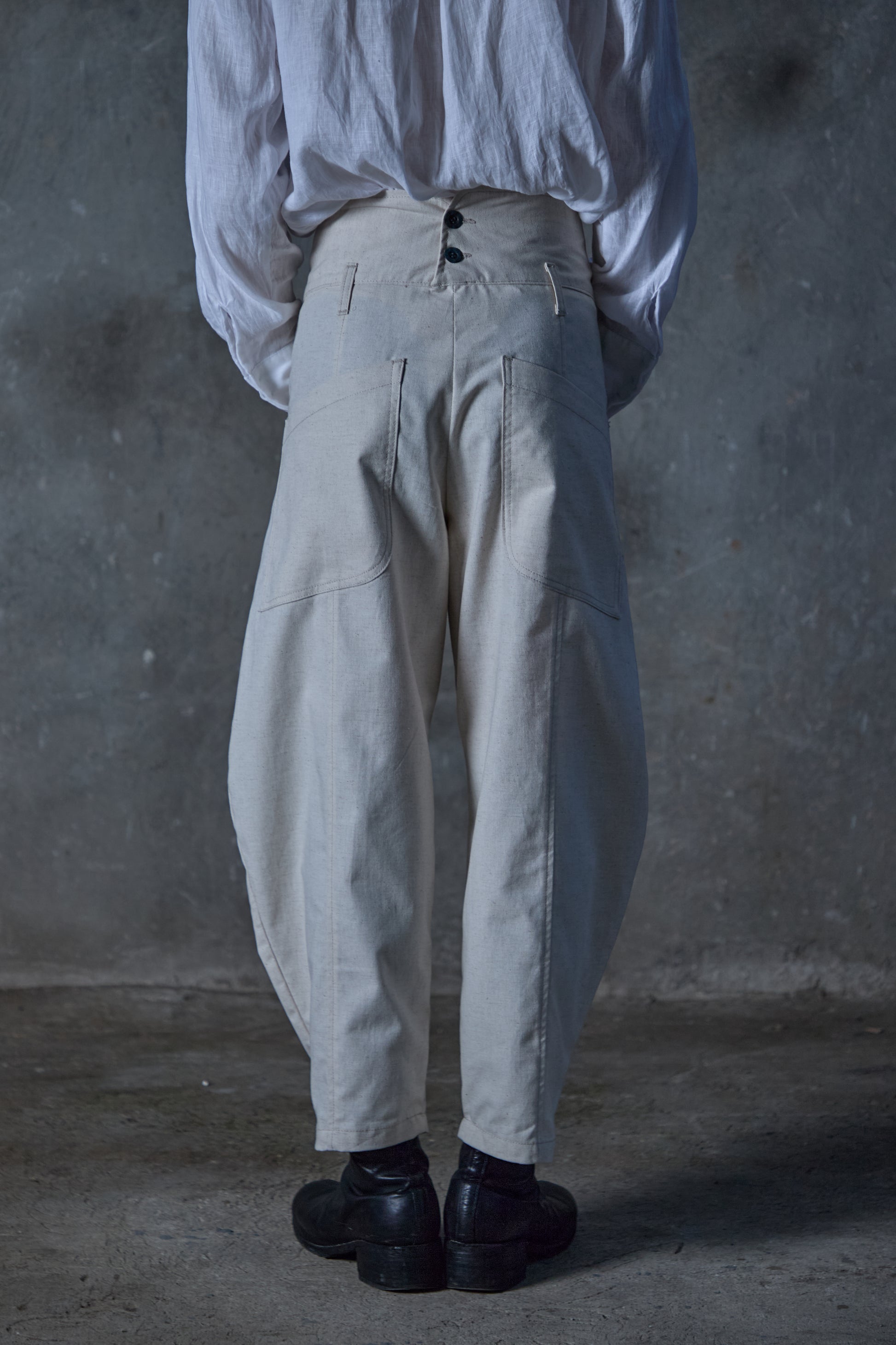 Corset-waist pants crafted from a Japanese cotton/linen “Kinari” fabric - a textile that hasn’t gone through any bleaching or dyeing process, resulting in a natural and organic finish. Outseams are patterned to have a curved silhouette and are subtly shaped by the darts placed at the inner knees. The waistband features a unique closure system with three buttons at the front and two at the back, allowing it to fold when unfastened. Finished with back patch-pockets and oxidized iron buttons sourced from Japan. Pair with the Duster Work Coat for the full set.