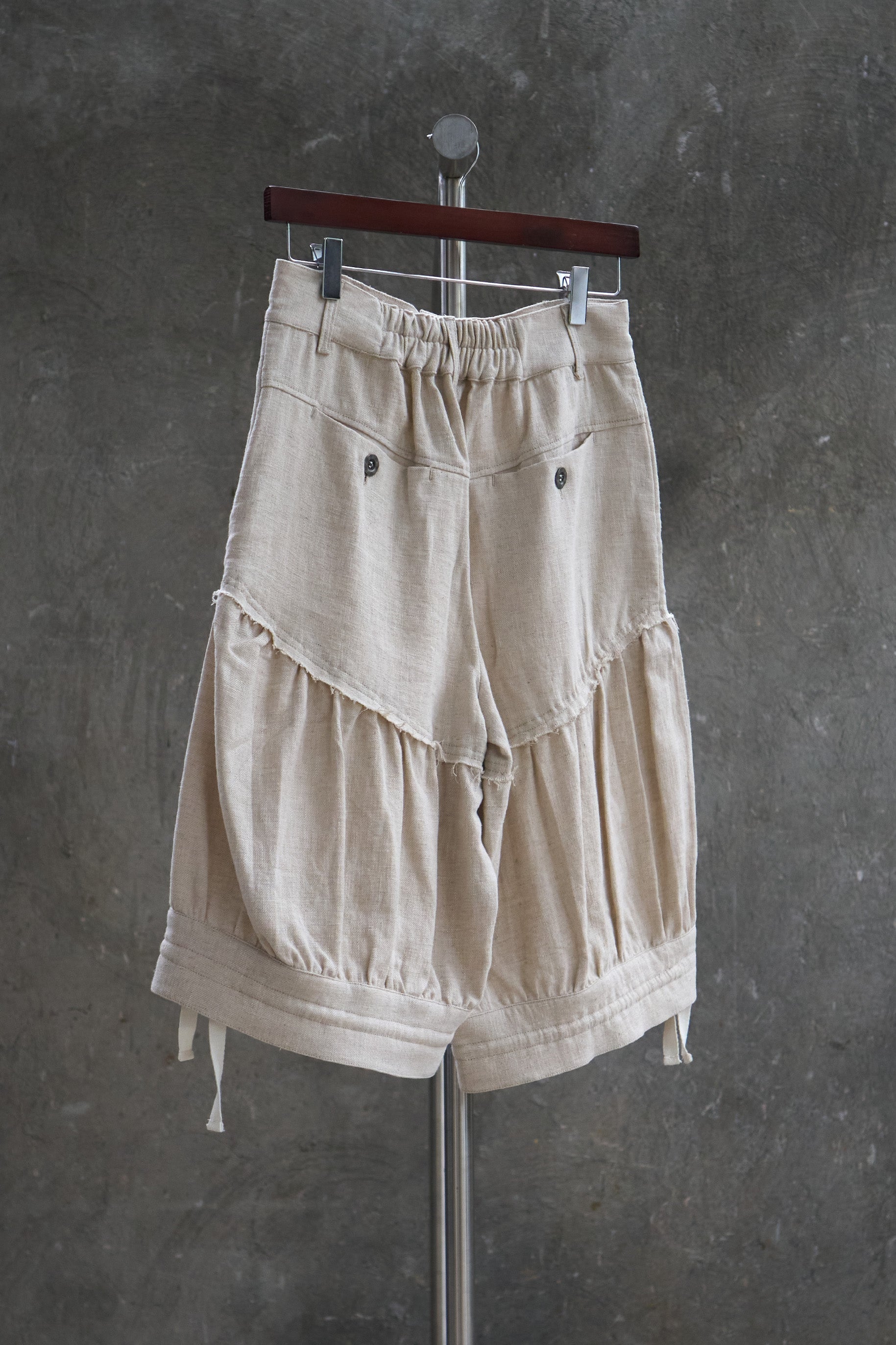 Inspired by antique French Renaissance theatre costumes, the Gathered Balloon Shorts are crafted from a linen fabric and feature shirred paneling along the legs. The bottom hems can be adjusted using internal cotton straps, allowing for a customizable silhouette. This iteration also utilizes a raw-edge finishing along the legs, while the semi-elastic waistband provides ease. Finished with double welt side pockets, back seam pockets, and brass buttons sourced from japan.