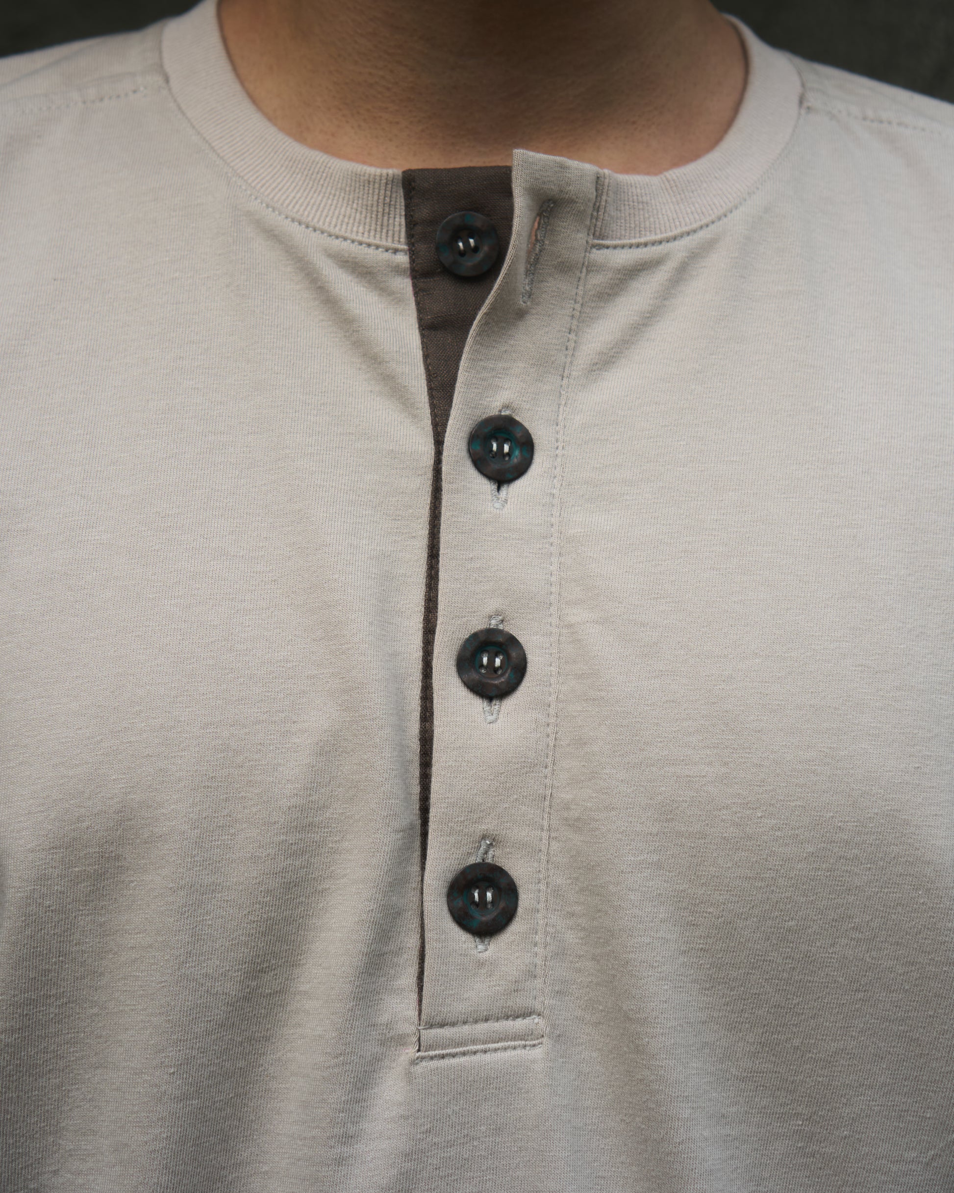Loose fit henley t-shirt cut from a 100% midweight cotton jersey fabric. A dolman-cut construction is utilized on the body and is contrasted by a raglan sleeve patterning at the back. The placket, which uses a contrasting 100% linen fabric, provides a two-tone effect to the shirt. Finished with side slits, interior cotton taping, and brass buttons sourced from Japan.