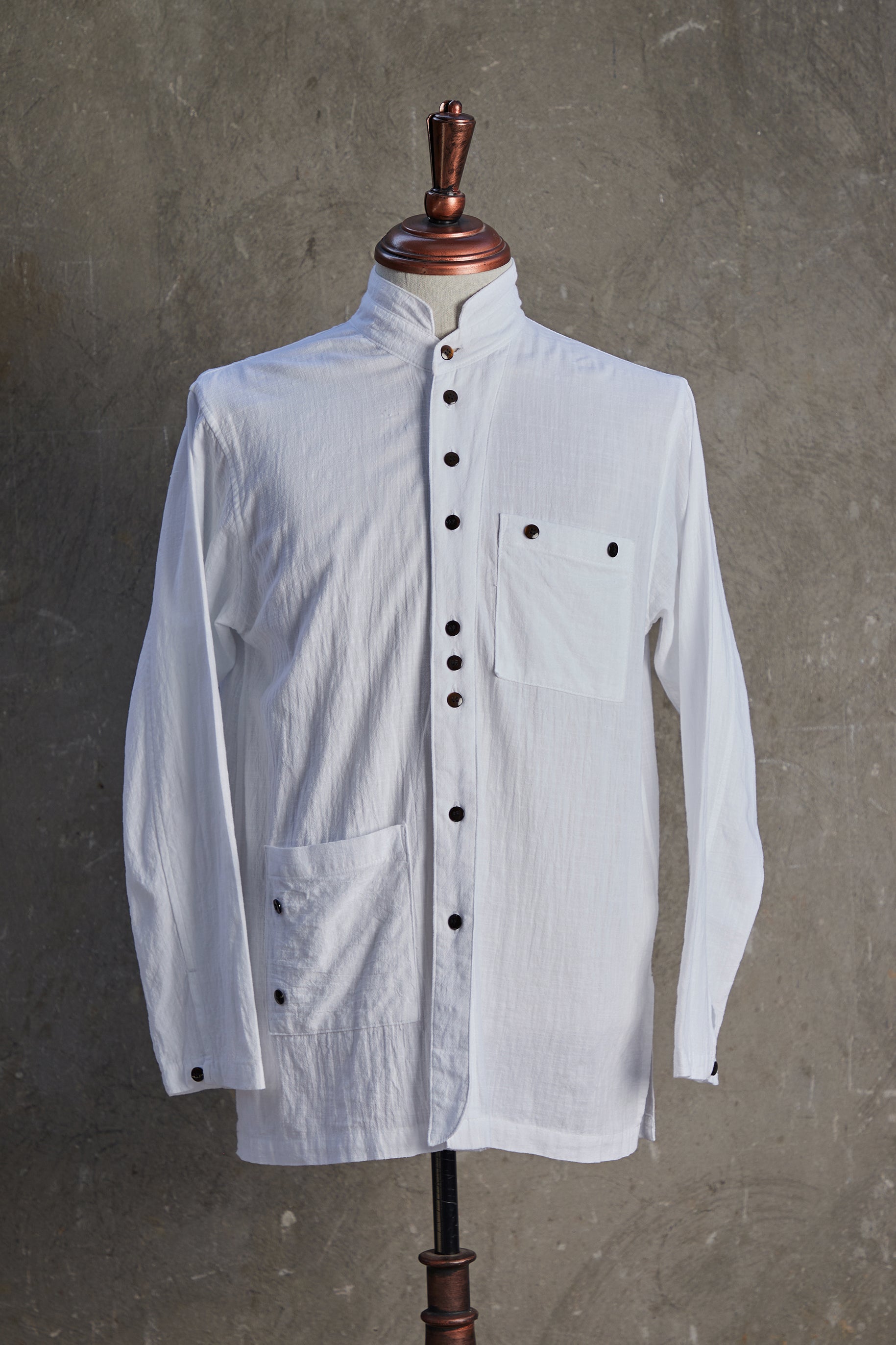 Cotton slub L/S shirt with a placket strap detailing. Crafted from a washed light-weight cotton slub fabric that is woven irregularly to give a natural texture, this shirt features a multitude of buttons throughout, giving the wearer a bevy of styling options. Stand-collar with two patch-pockets on the front. Finished with a straight hem and side slits.