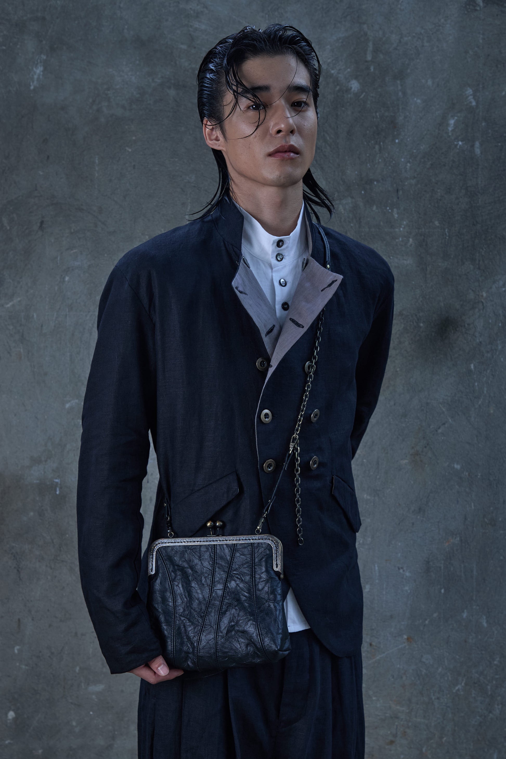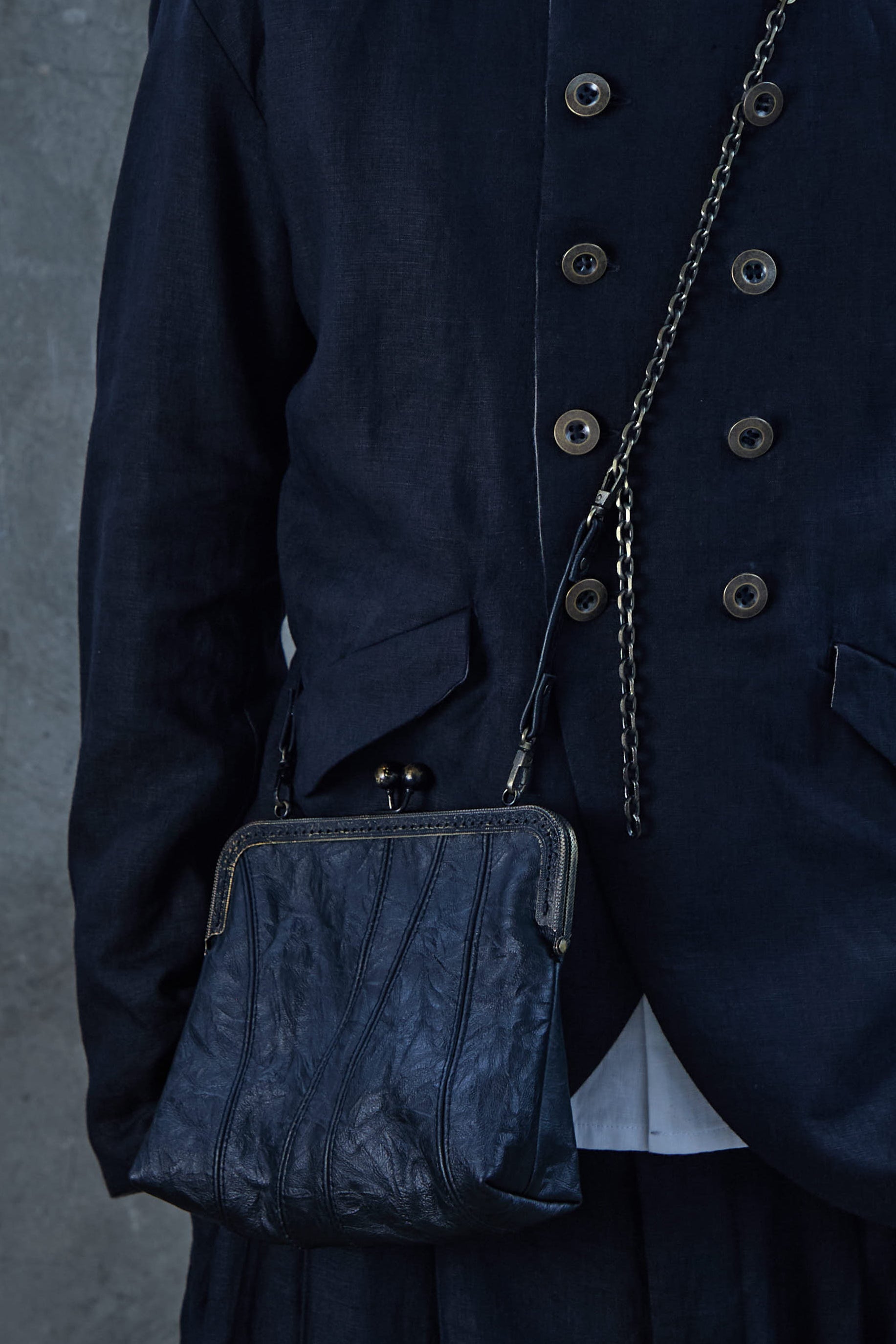 Medium sized clasp bag crafted from a wrinkled cowhide leather, with curved panelling throughout the body. Distressed finishing is applied on all the hardware used, complimenting the aged nature of the wrinkled leather. Swivel hooks secure the adjustable chained strap, and are reinforced with rivets for durability . Lined with a cheesecloth fabric and is finished with a hand-sewn kisslock closure.