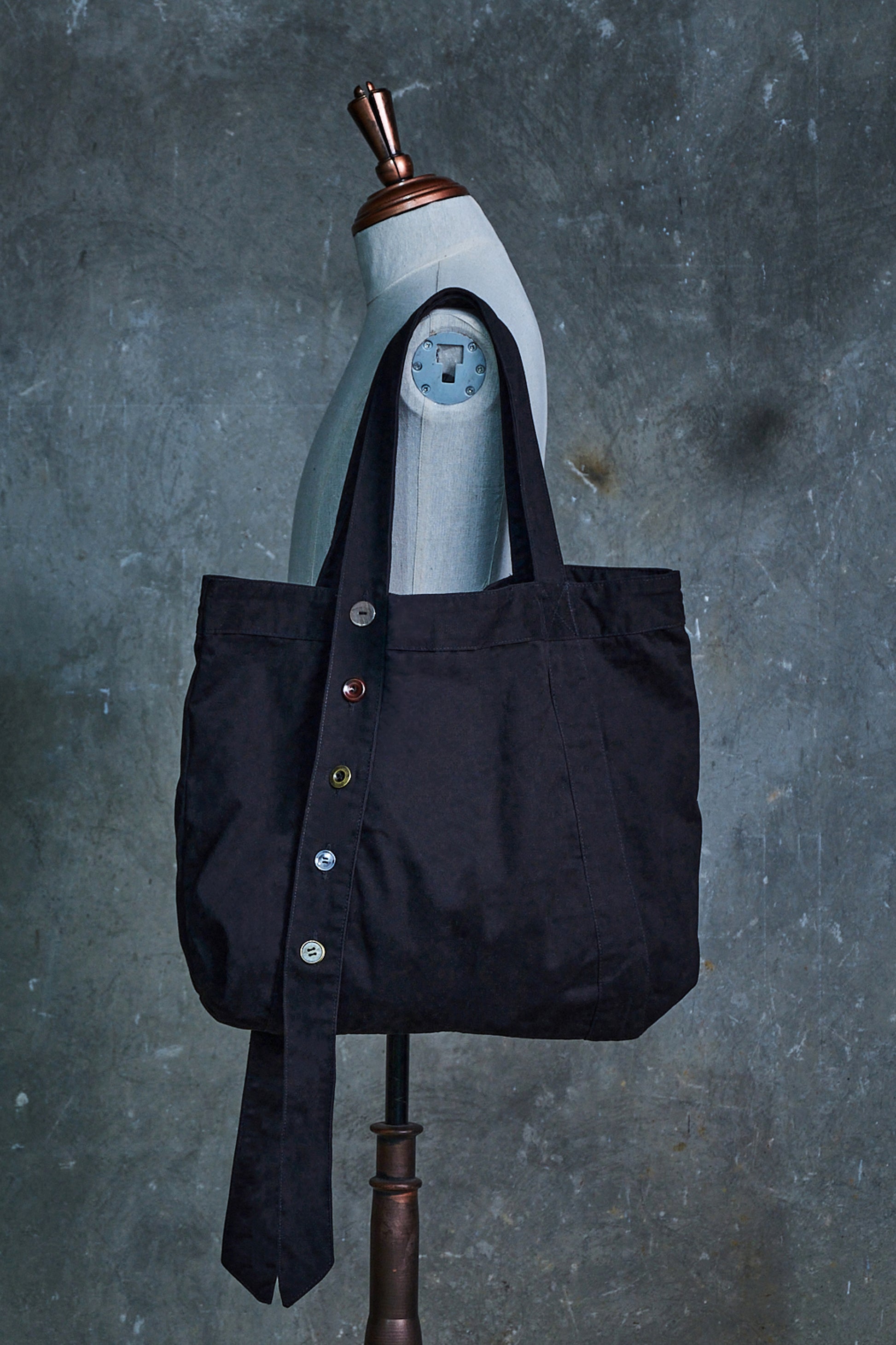 Oversized tote bag crafted from a pure cotton twill fabric, designed with an adjustable strap fastened by an assortment of mismatched buttons. Interior storage includes a large patch pocket with multiple compartments, including a dedicated slot for pens. Completely unlined and finished with internal bias bound seams.