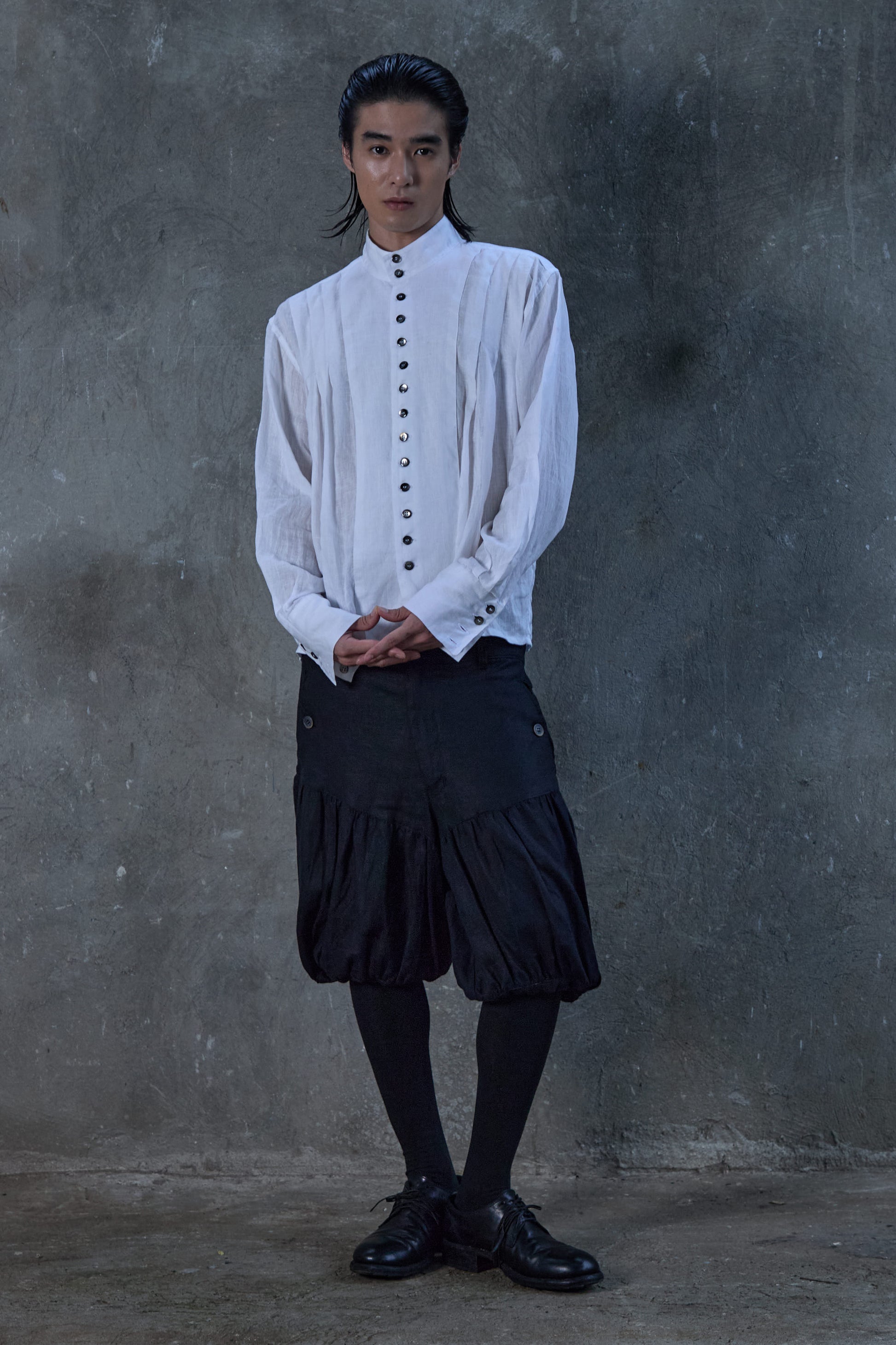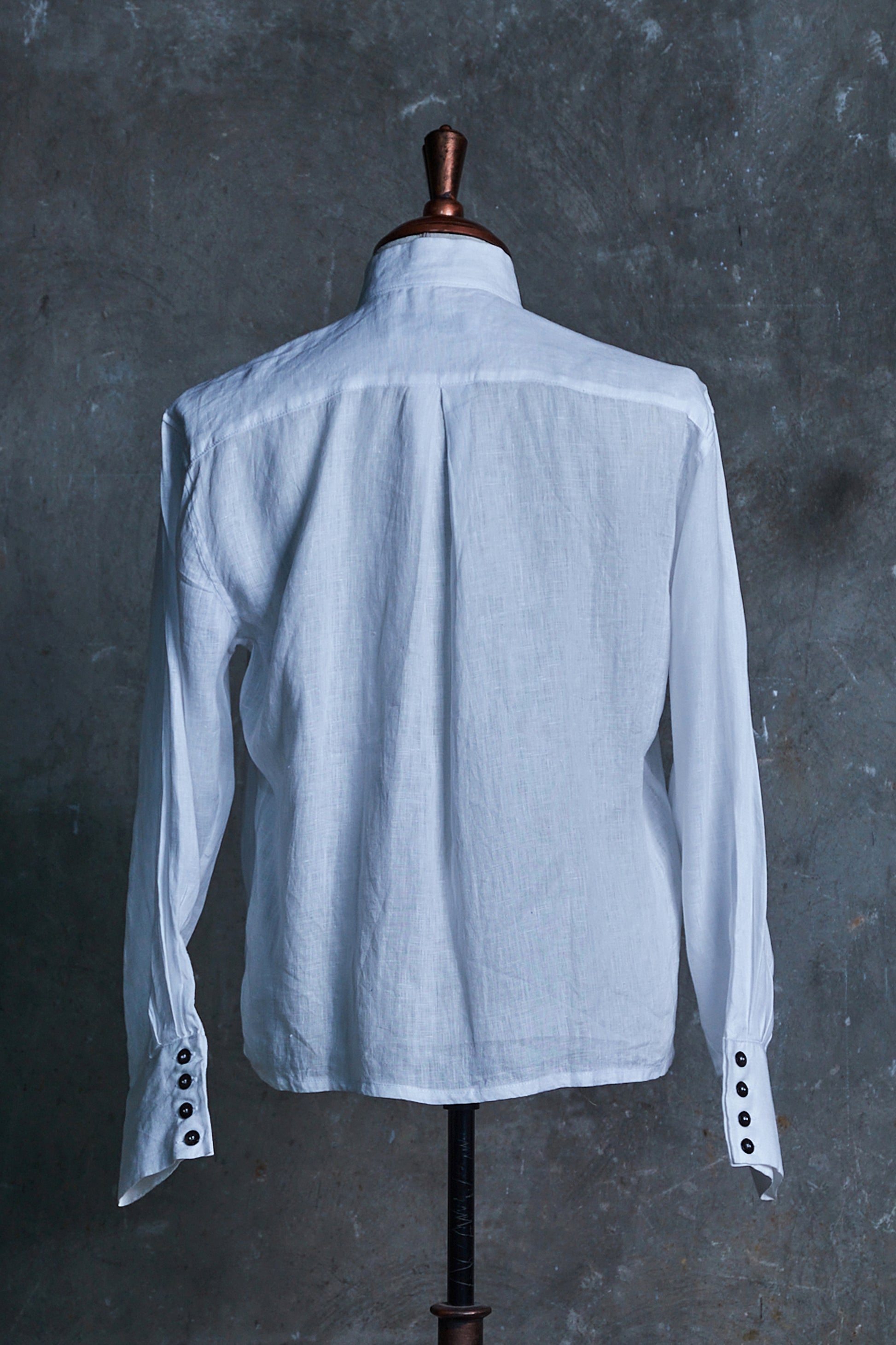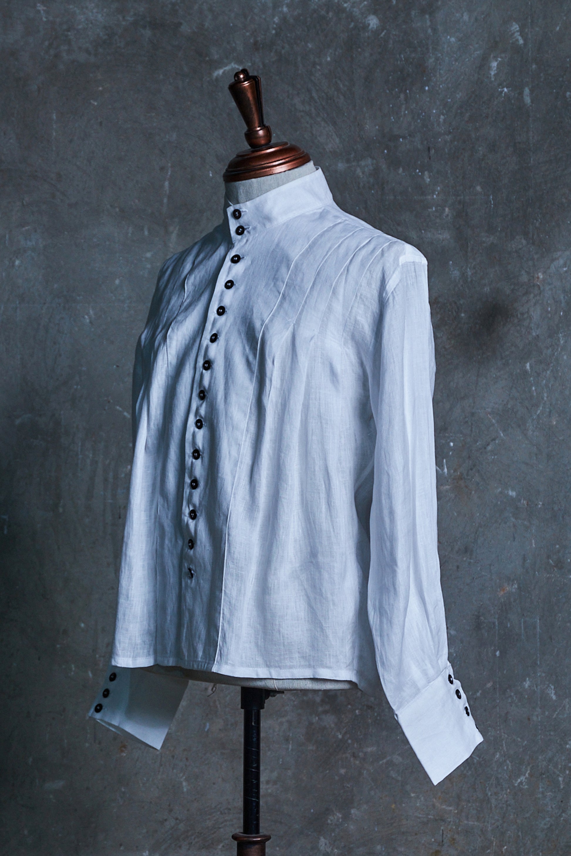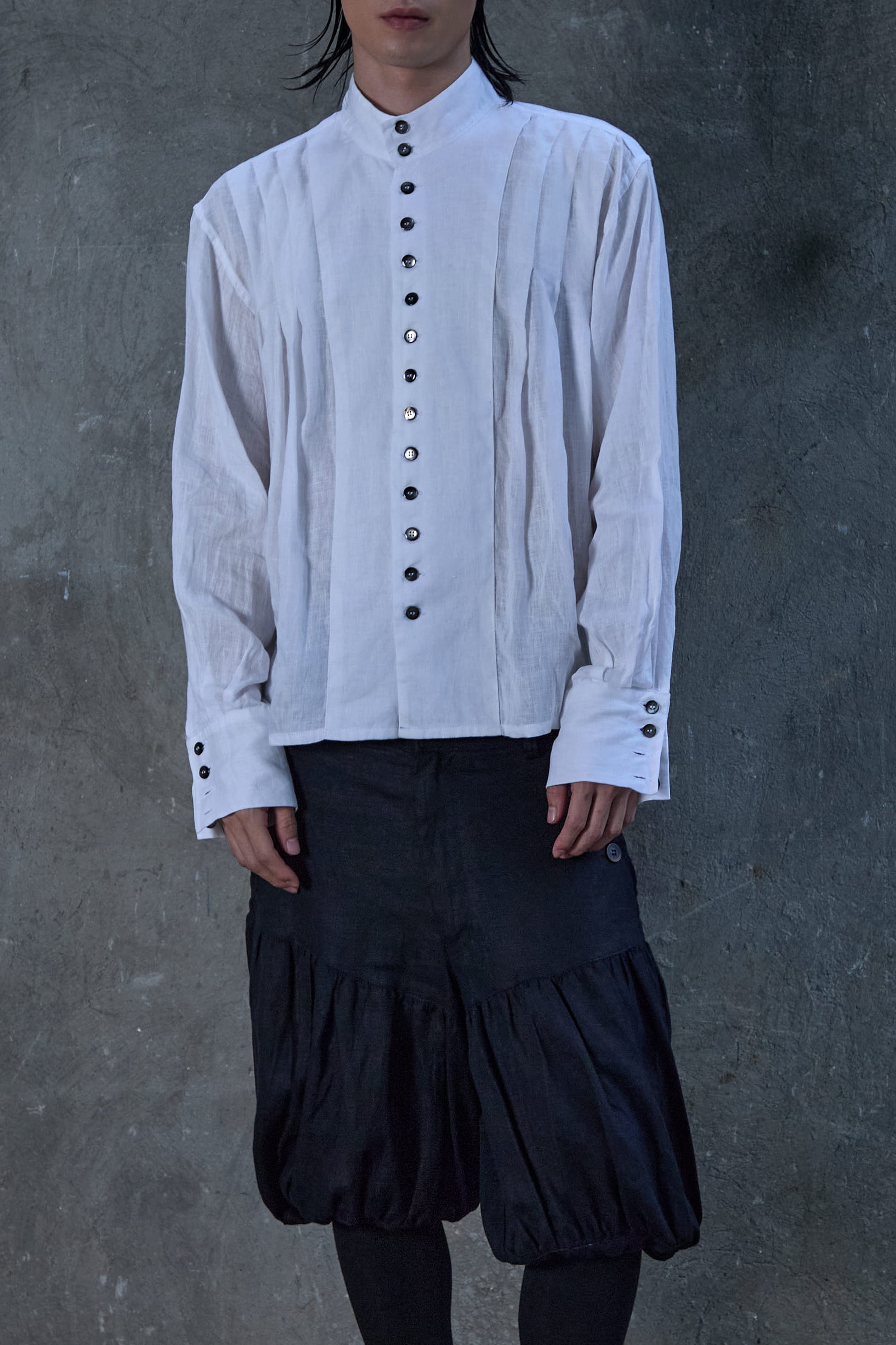 Boxy-fit shirt long-sleeve shirt inspired by 18th century smocks. Crafted from a pure linen fabric, the Pleated Smock Shirt features multiple intricate pleating at the front to create volume, echoing the multiple buttons used on the placket. Additional details include extended french cuffs, a stand collar, and a reversed box pleat at the yolk. The shirt is constructed with French seams throughout for a clean, durable interior.