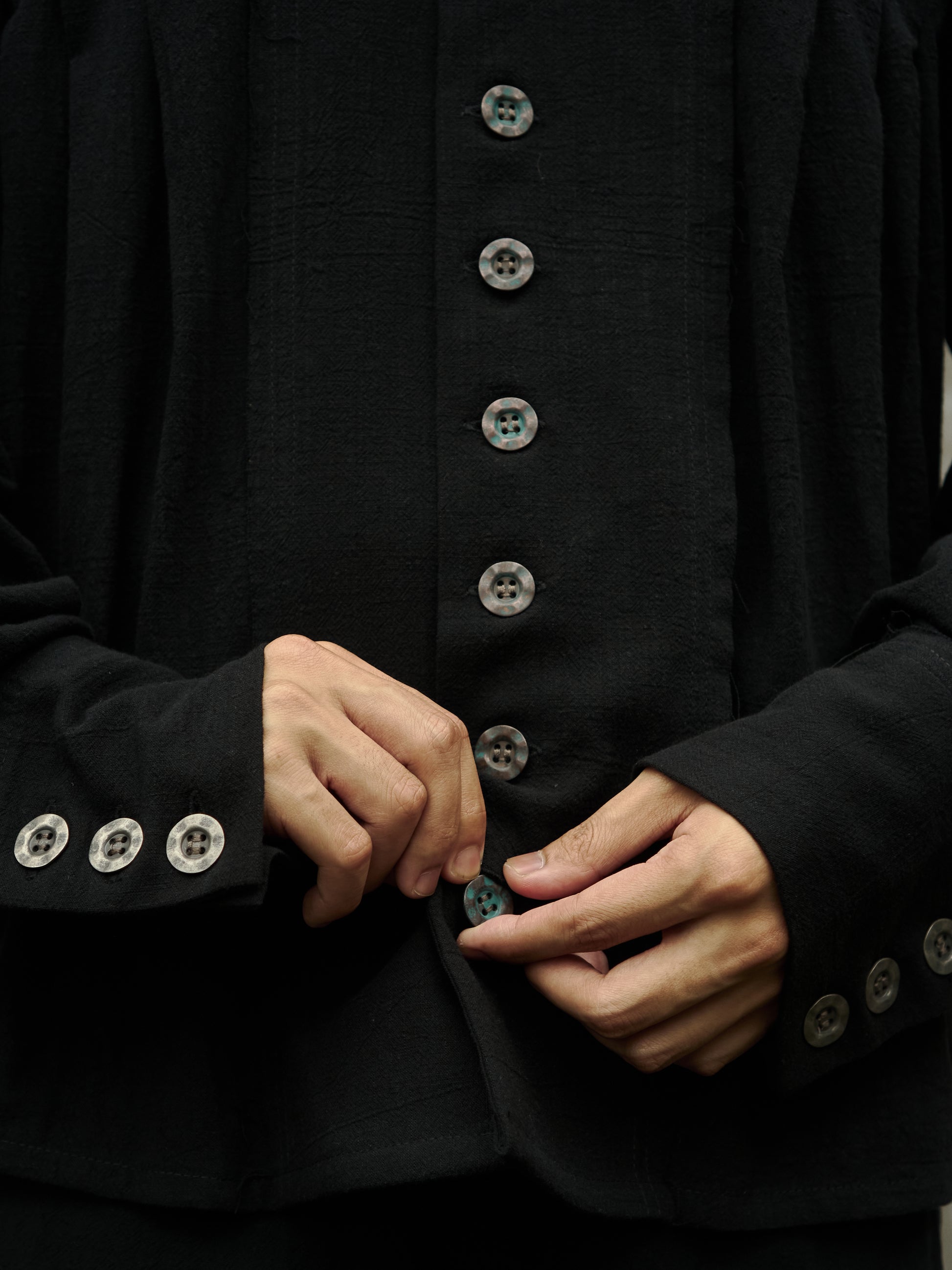 Boxy-fit long-sleeve shirt inspired by 18th century smocks. Crafted from a 100% cotton slub fabric, the Pleated Smock Shirt features multiple intricate pleating at the front to create volume, echoing the multiple buttons used. This iteration utilizes raw-edge finishing on multiple parts of the shirt. Finished with brass buttons sourced from japan.