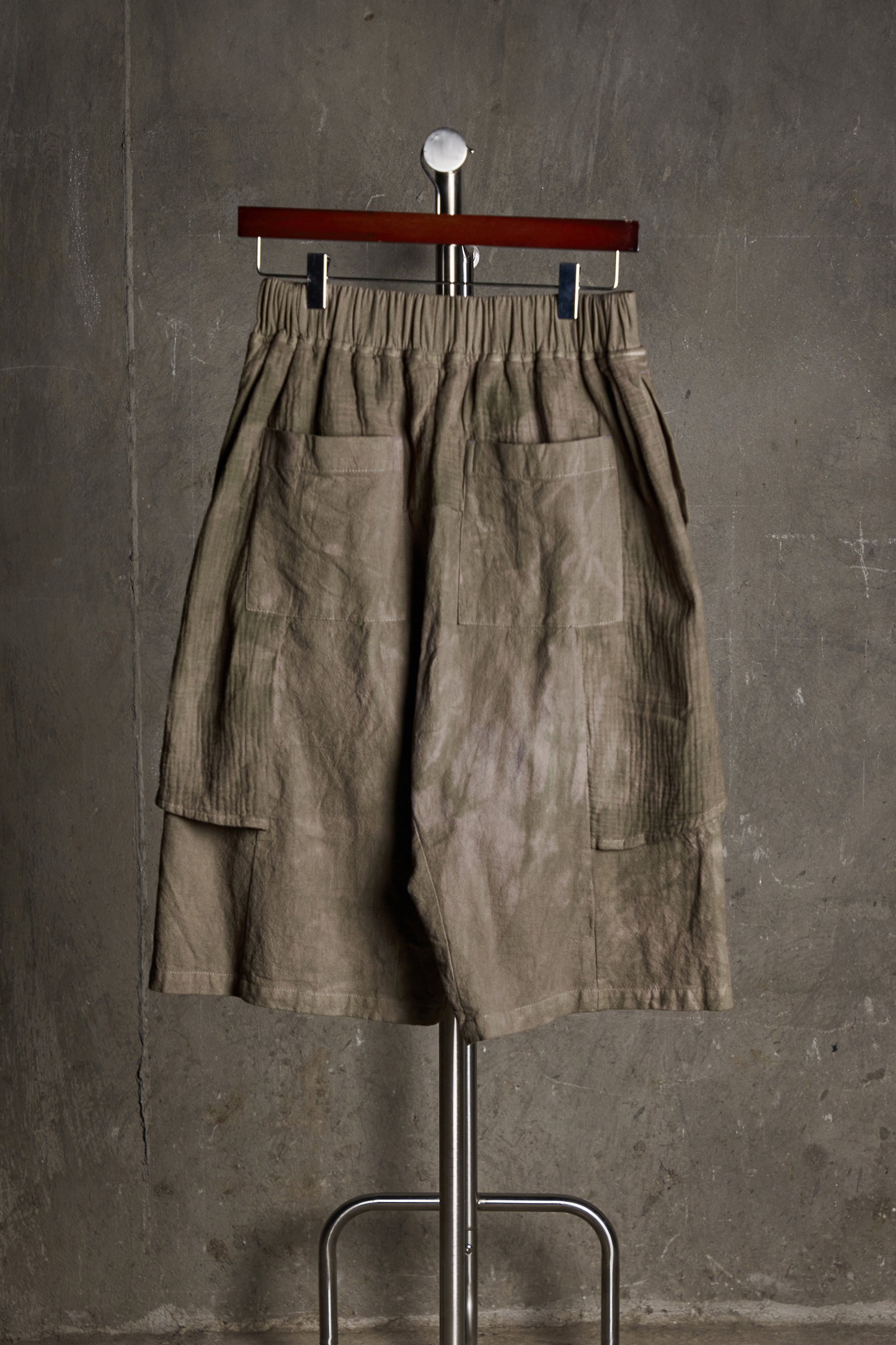 Wide shorts with an elasticated waistband crafted from cotton/linen blend and double-gauze cotton fabrics. As the name suggests, these shorts feature a double-gauze cotton overlay that wraps the legs, giving the piece a layered silhouette. Cut with a slight drop crotch and is reinforced by a rectangular gusset piece. Finished with welt pockets on the side and patch pockets at the back. This article has then been hand-dyed in-house to achieve an uneven color, making each piece unique.
