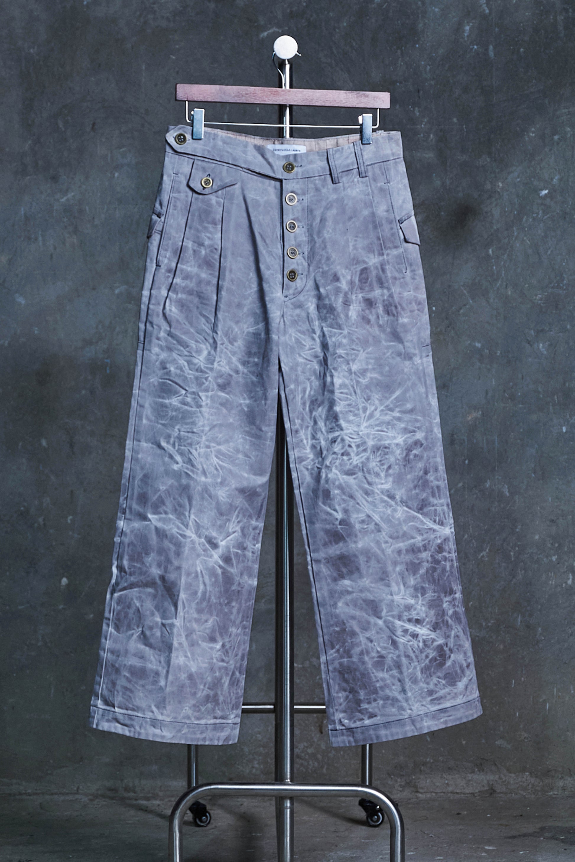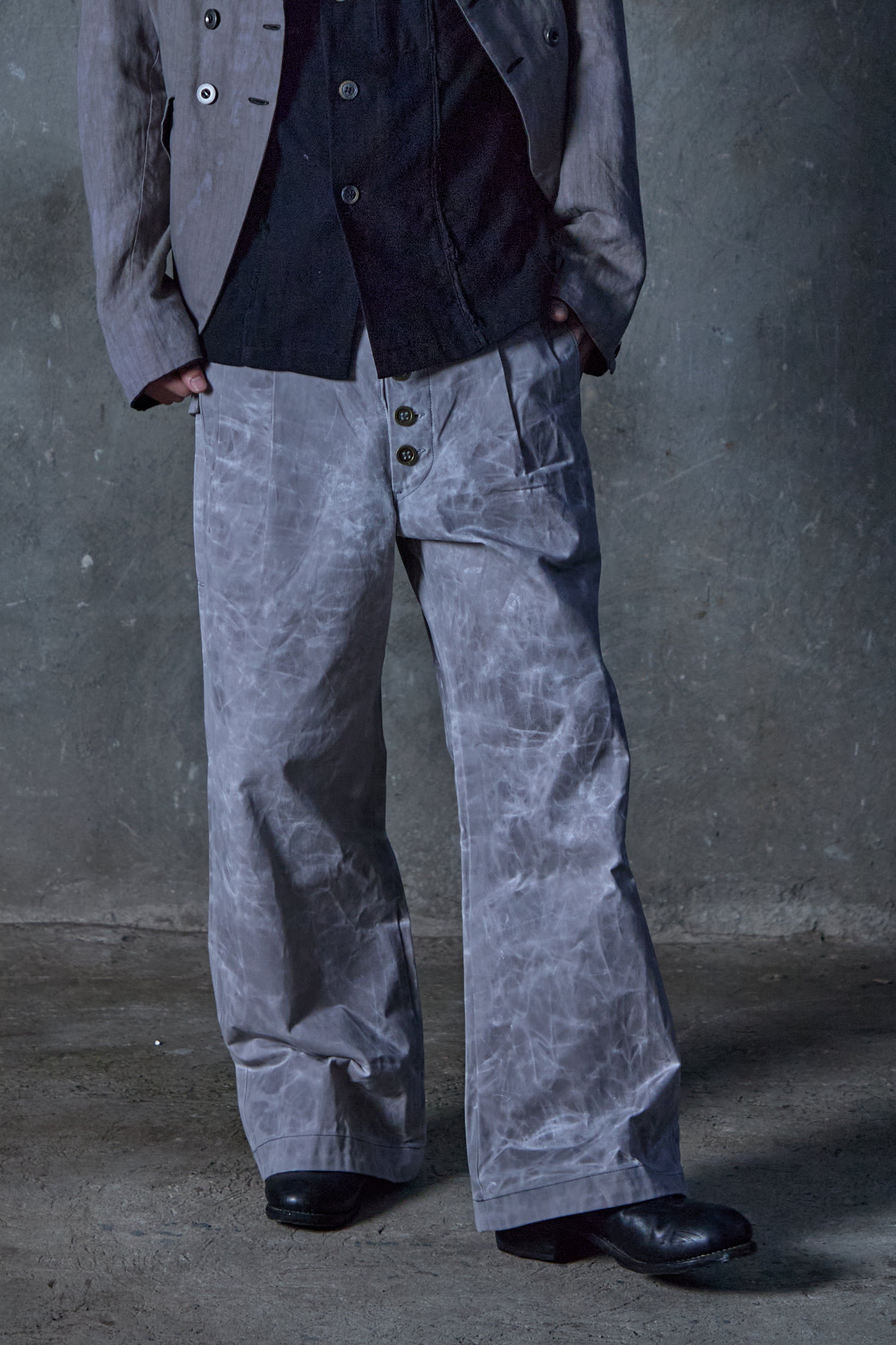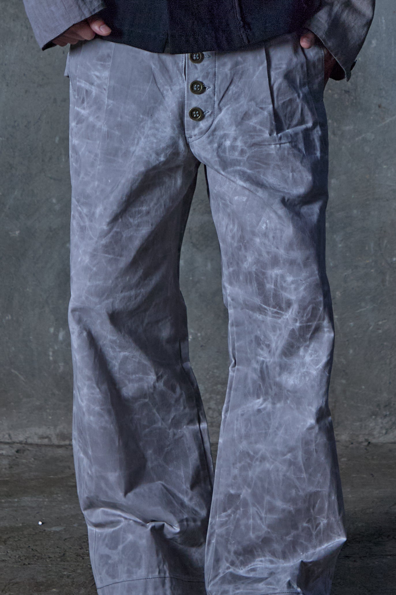 Wide leg trousers with an exposed button fly, crafted from a pure cotton twill fabric. The extended waistband design borrows cues from Gurkha-style trousers and is complemented by the single coin pocket at the front. Spacious panel pockets are incorporated at the back for added functionality. Finished with a gray striped linen lining and metal buttons. The trousers were then hand-coated with wax in our atelier for a marbly texture and finish.